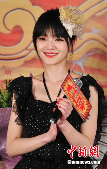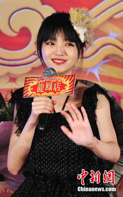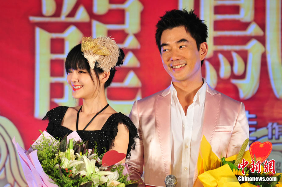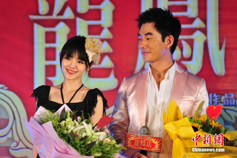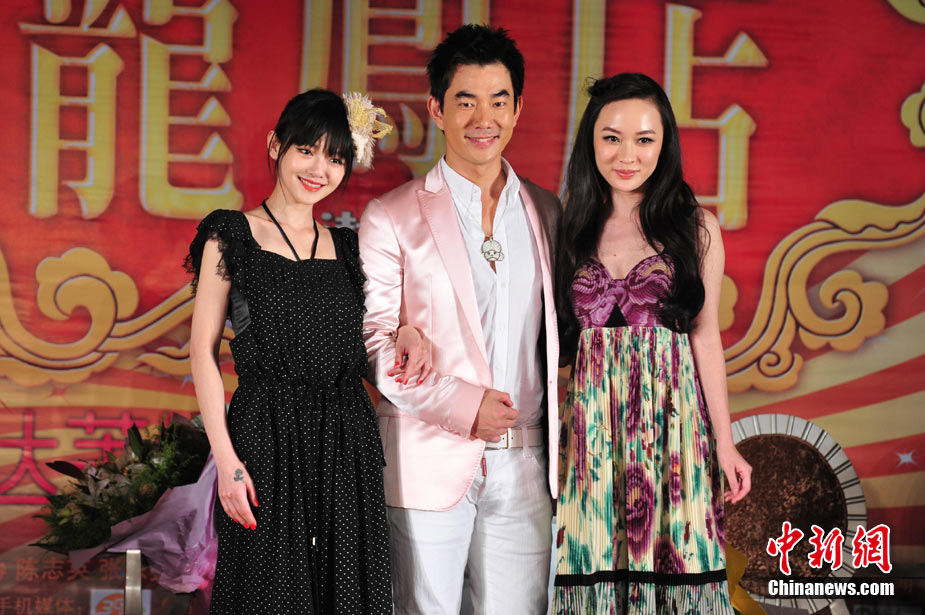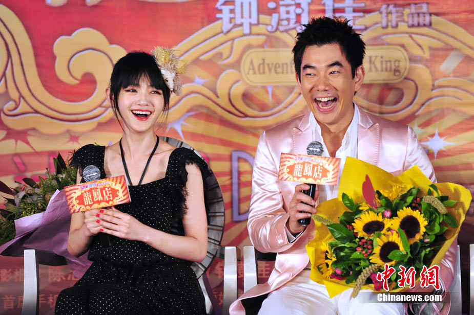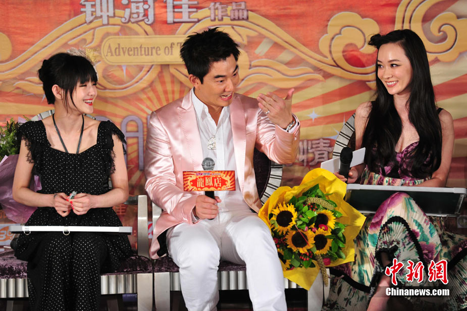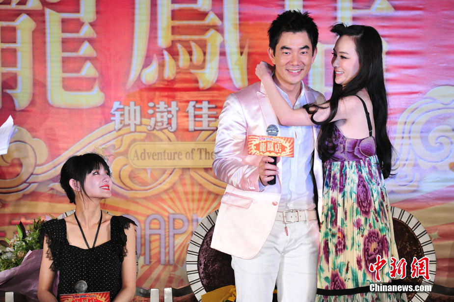 7月30日,古装爱情喜剧《龙凤店》在京举办官网启动暨终极海报揭幕发布会,导演钟澍佳携主演任贤齐、大S、霍思燕亮相,台湾著名音乐人小虫前来助阵。大S头戴“刺猬”发卡可爱亮相,与任贤齐在现场大谈对唱《龙凤店》主题曲的感受,大S笑称唱歌比小S好听。后来登台的霍思燕却大抢大S风头,她为任贤齐亲手戴上礼物项链,还亲密拥抱久久对视,两人在现场大秀亲昵立刻成为众人瞩目焦点,让大S在一旁有点没事做。中新社记者 李学仕摄