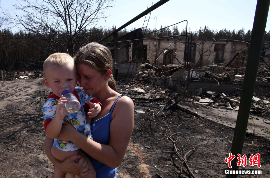 一位母亲怀抱婴儿在废墟前哭泣。高温、干旱引发山林大火,火势迅速蔓延至俄罗斯西部,火场面积1日内已增加30%,超过1200平方公里。到现在,大火已经造成37人丧生,其中包括3名在救火过程中以身殉职的消防员。最少1260间房屋被大火吞噬,造成数千人无家可归。
