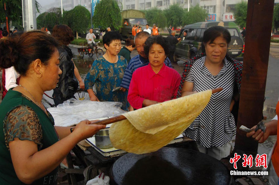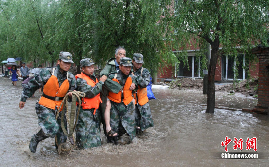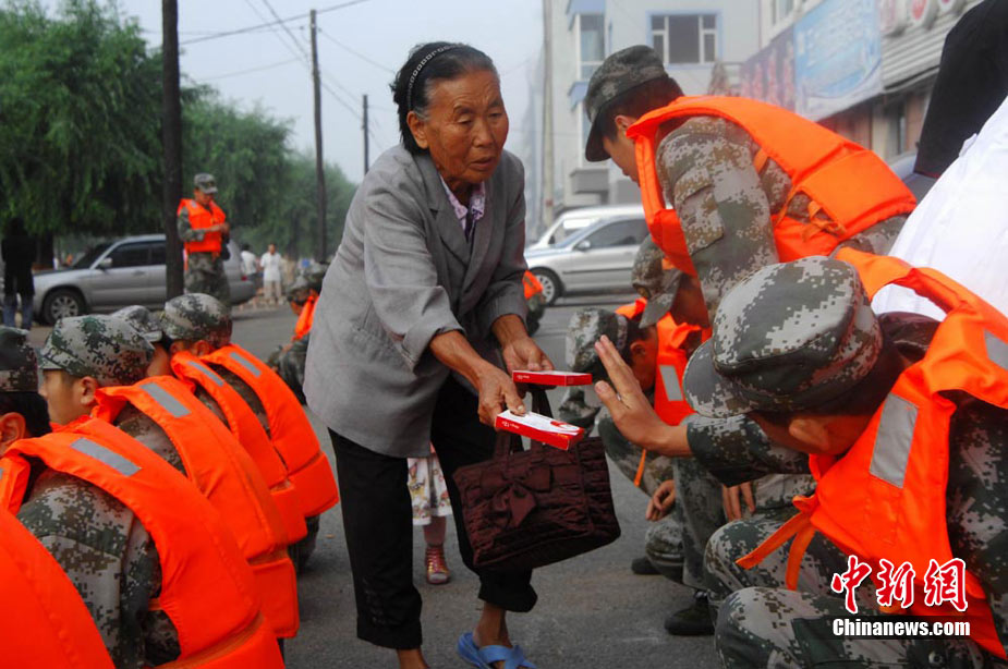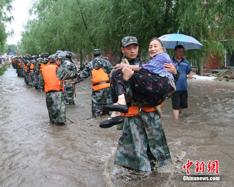 28日以来的一场暴雨让吉林省多个地区遭遇罕见洪灾,此后对灾区的救援紧张进行。目前在永吉县口前镇,已有部分商户恢复营业。图为在重灾区永吉县,士兵将一名老妇转移到安全地带。中新社记者 张杰 摄