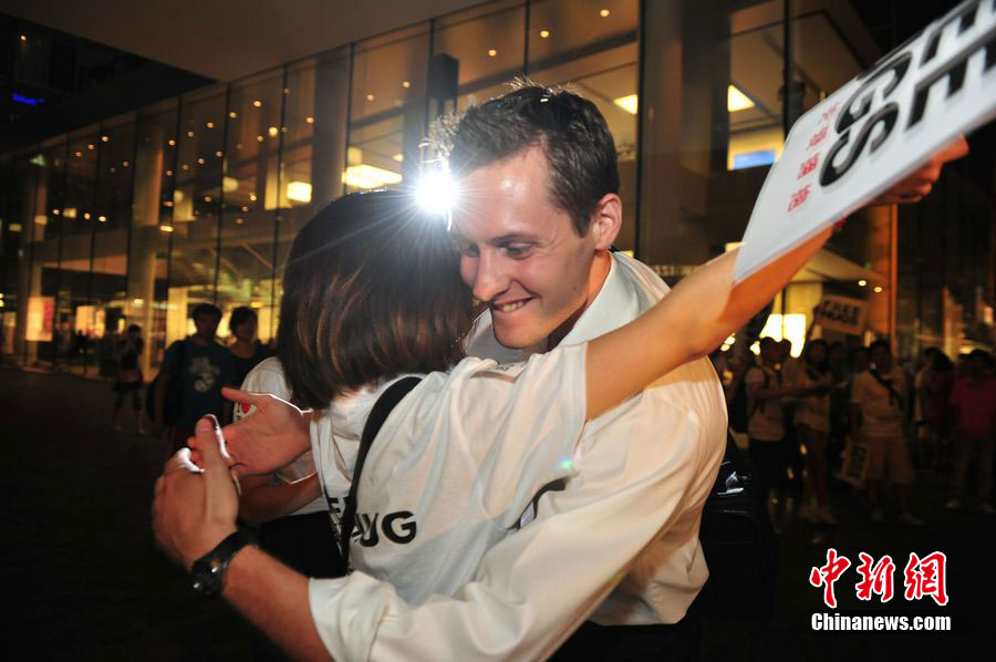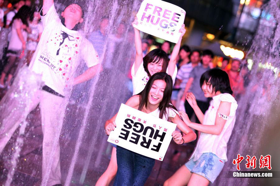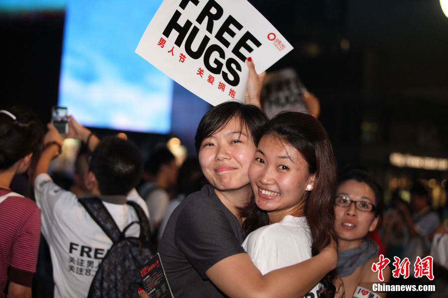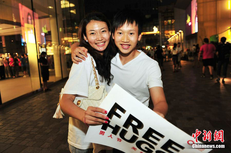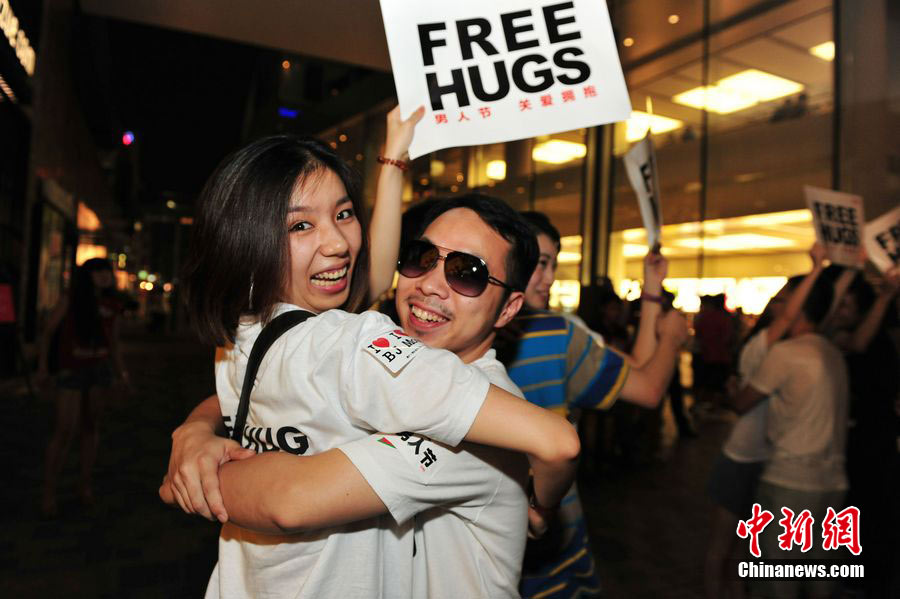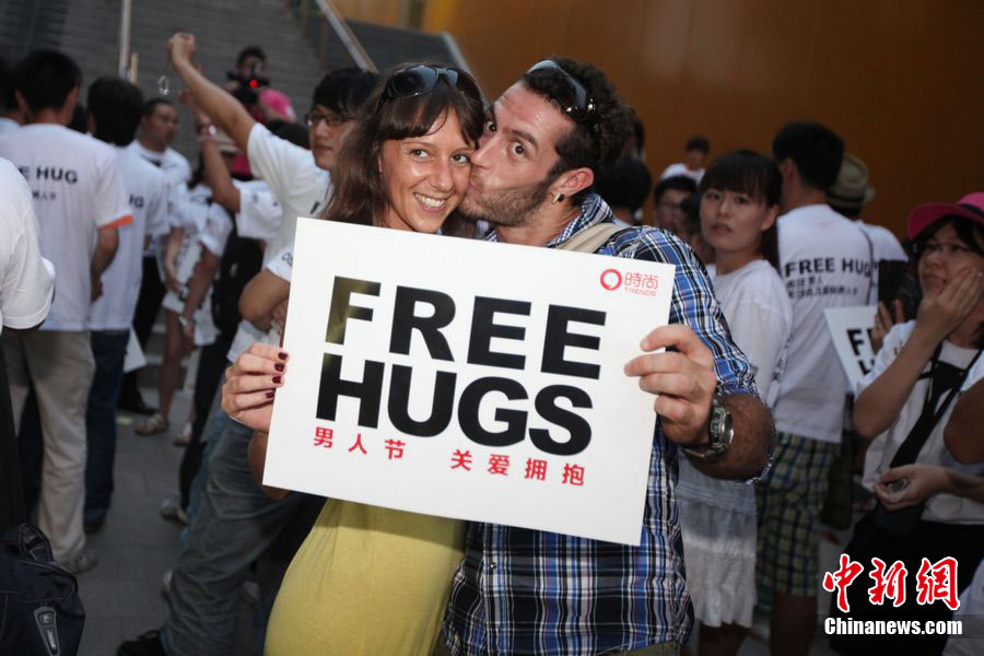 8月3日晚,在北京三里屯,俊男靓女们举起Free Hug(免费的拥抱)的大牌子,向陌生人们发起了自由拥抱的邀请,现场千人不分男女老少相互拥抱致意。“Free Hug”活动起源于欧美,是一种倡导关心和理解的交流方式。中新社发 李学仕 摄