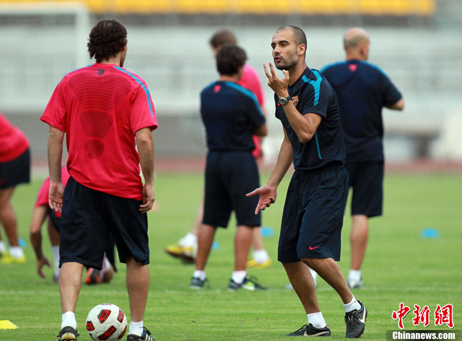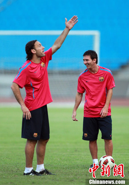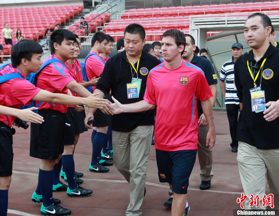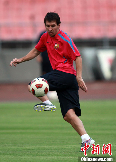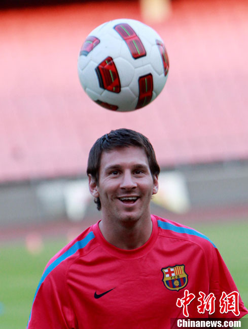 8月6日,巴塞罗那俱乐部在北京工人体育馆进行了第二次公开训练课,众多巴萨球迷也在现场目睹了球队风采。图为梅西出场表情轻松。中新社发 杜洋 摄
