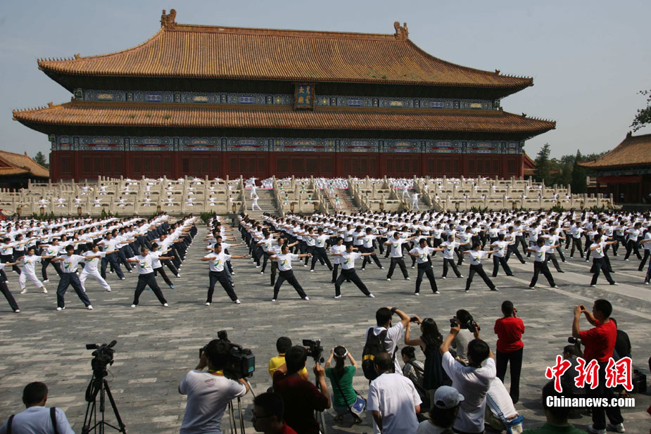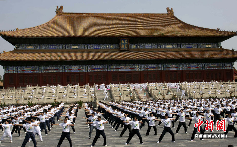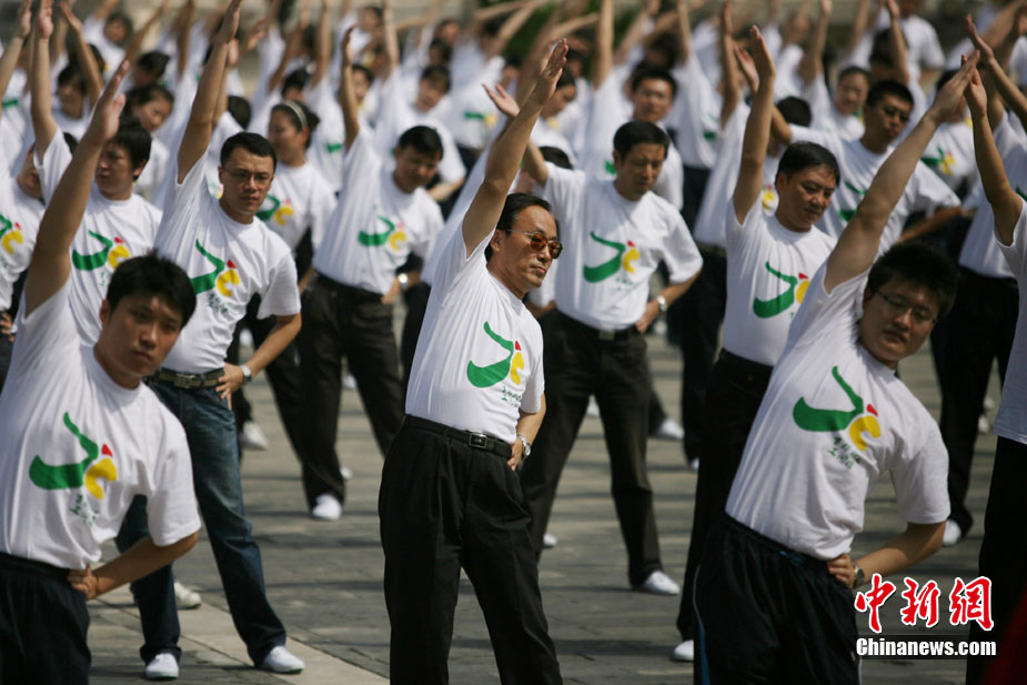 8月10日,北京50余个基层单位和表演团体的近3000余名职工工间操小教员在北京市劳动人民文化宫太庙前与副市长、体育明星和劳模们一起做“第八套广播体操”。当日,2010首都职工示范推广工间操宣传周启动。中新社发 苏丹 摄