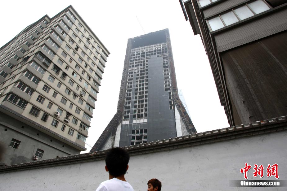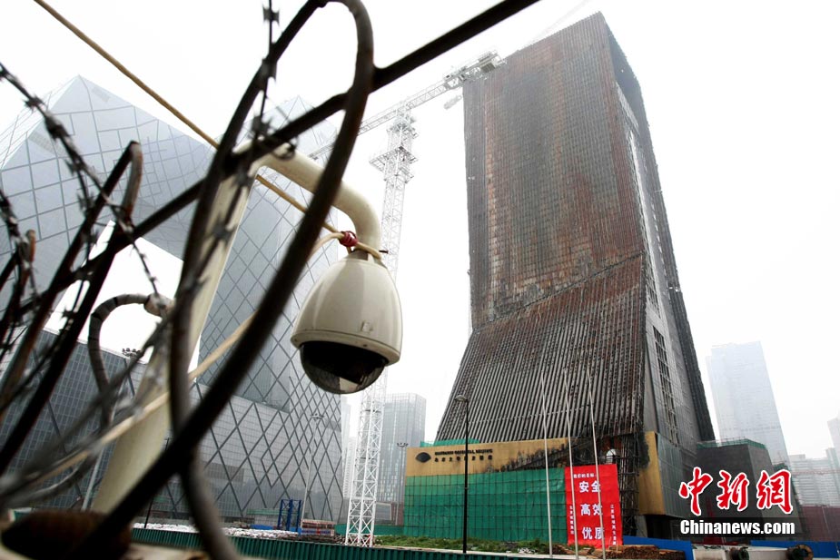 8月11日,中央电视台电视文化中心工程(北配楼)拆卸复建施工正式启动。据了解,当日启动的是金属幕墙和网架的拆卸。由于主题结构未受到严重影响,因此复建后的大楼将基本保持“原样”。这标志着2009年2月9日中央电视台大火一年多后,央视新址北配楼终于正式进入拆卸复建阶段。中新社发 富田 摄