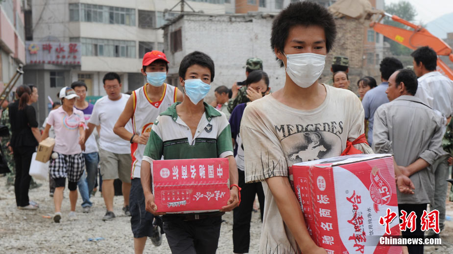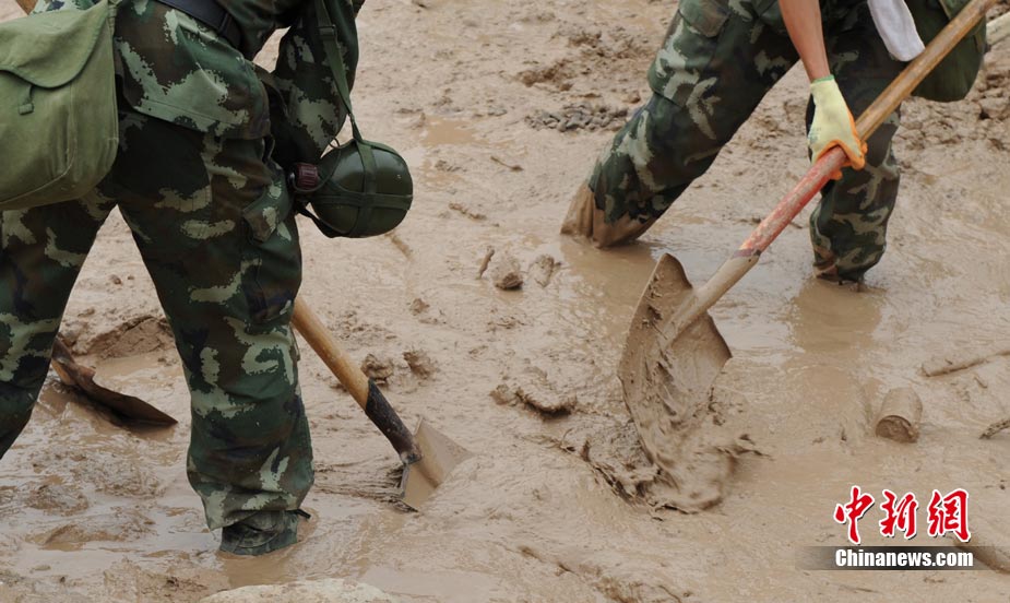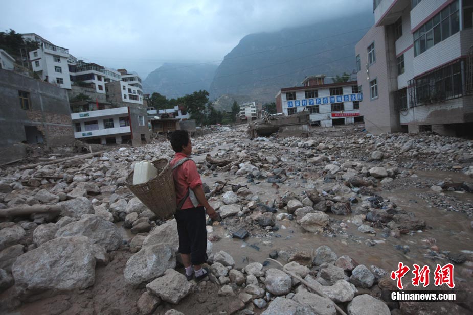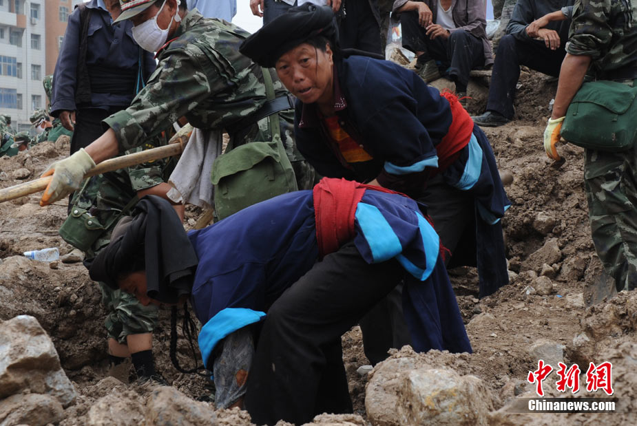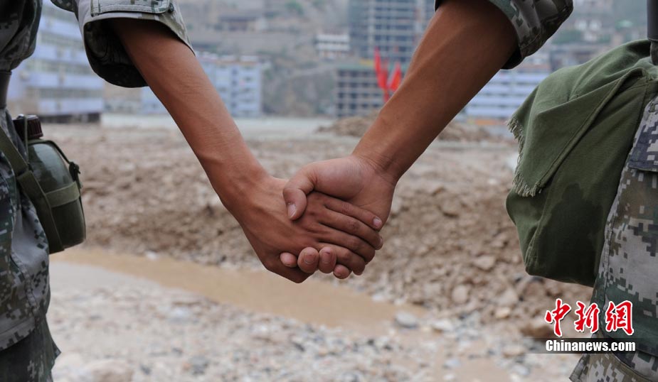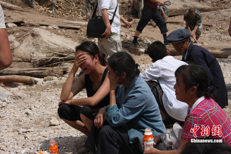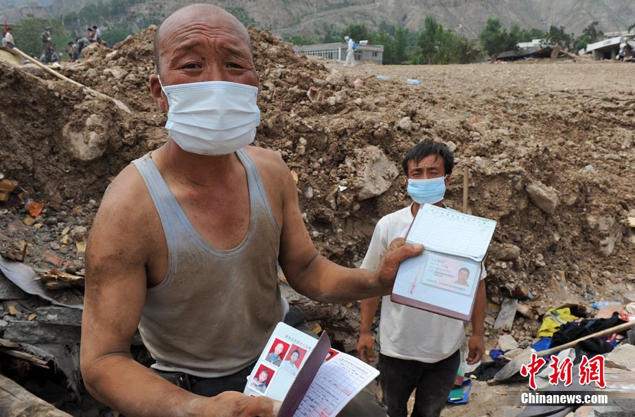 8月11日,甘肃舟曲泥石流灾区,五旬男子李九明从废墟中挖出了自家的户口簿、医疗保险证书等,看到证书夹层中遇难儿子生前的照片和身份证,不禁失声痛哭。中新社发 曹多然 摄