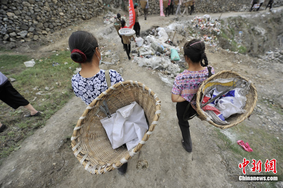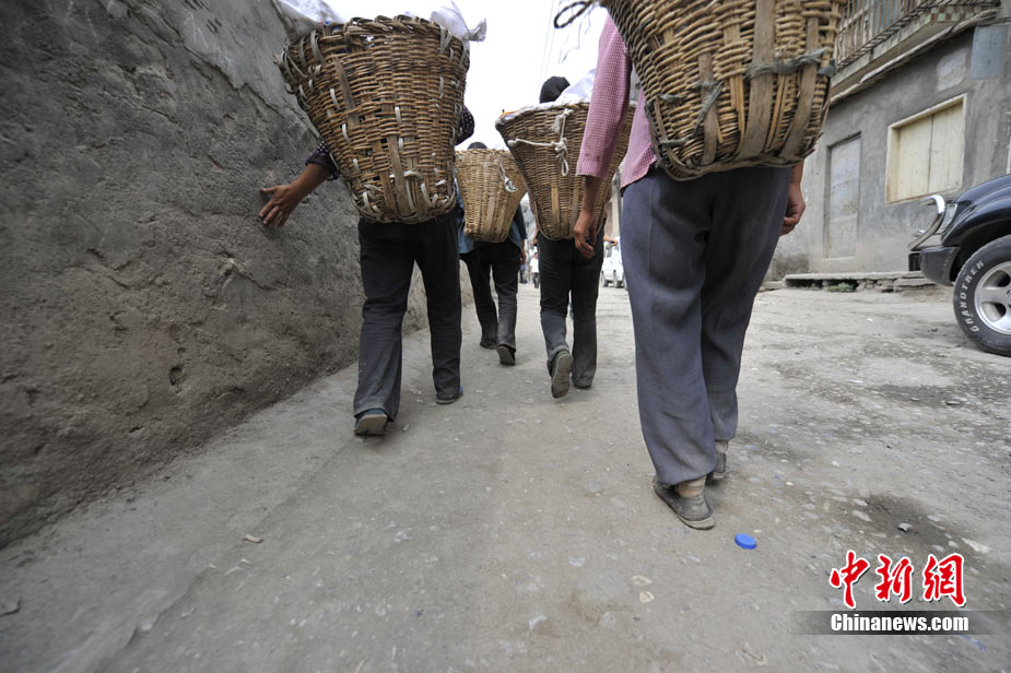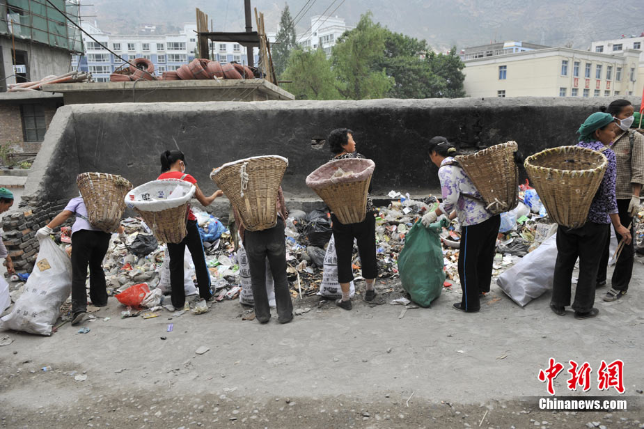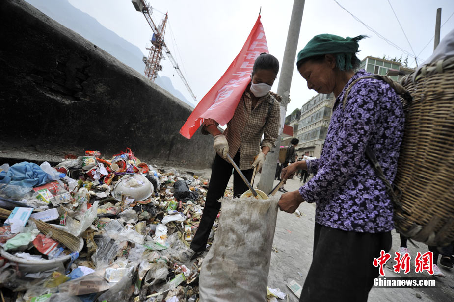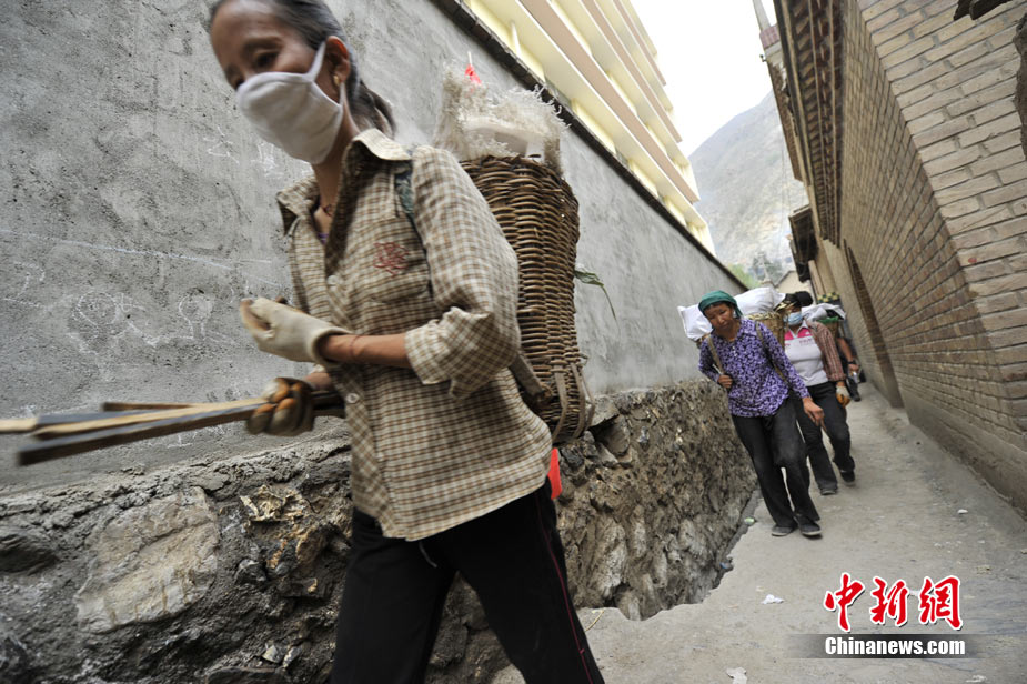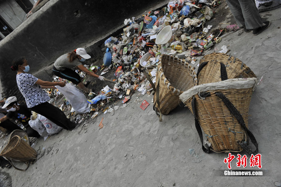 8点多,王旻桂和姐妹们装起第一背篓垃圾,高高低低、曲曲折折、穿街走巷。城区中身着各种专业服装、携带各种专业设备的救援队来来往往。而这支“低调”的“突击队”还是引人侧目。
