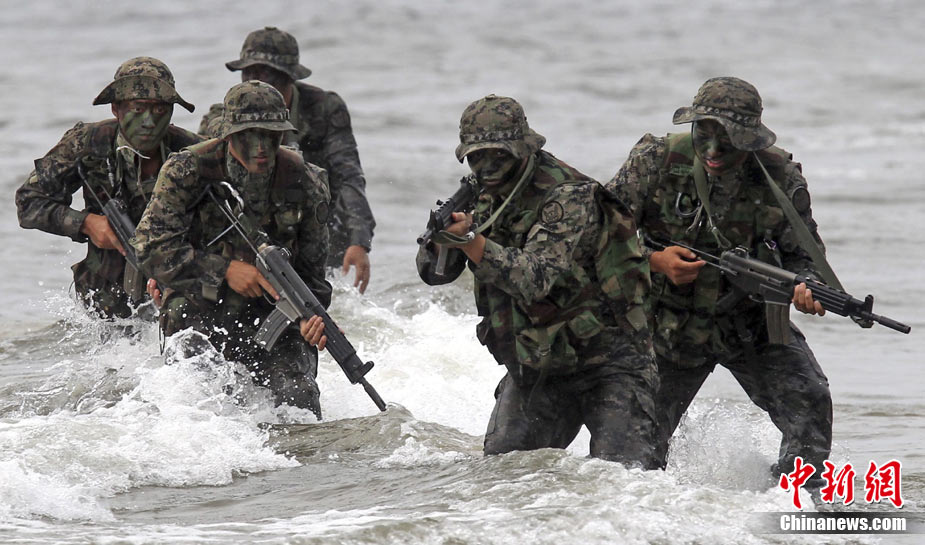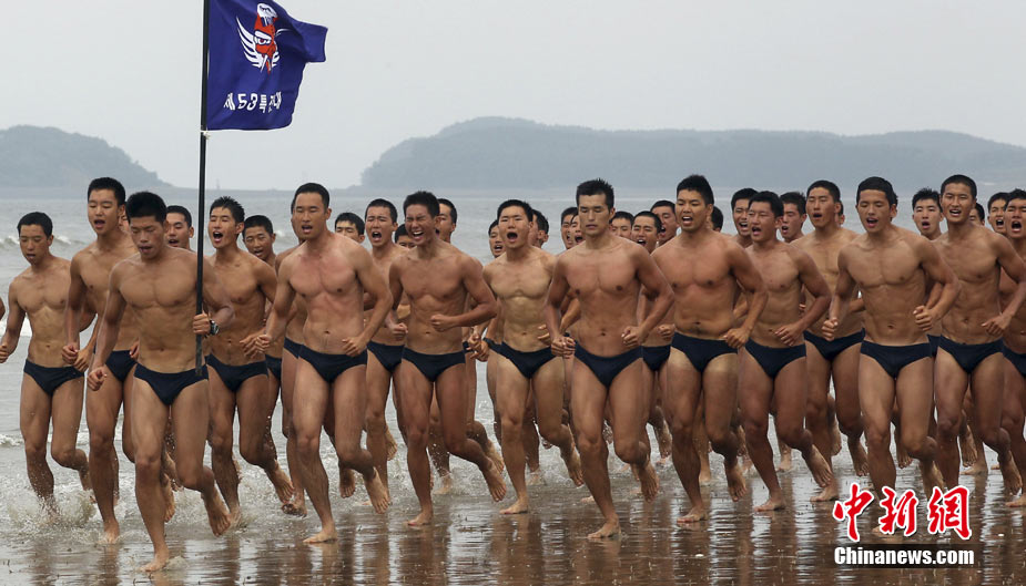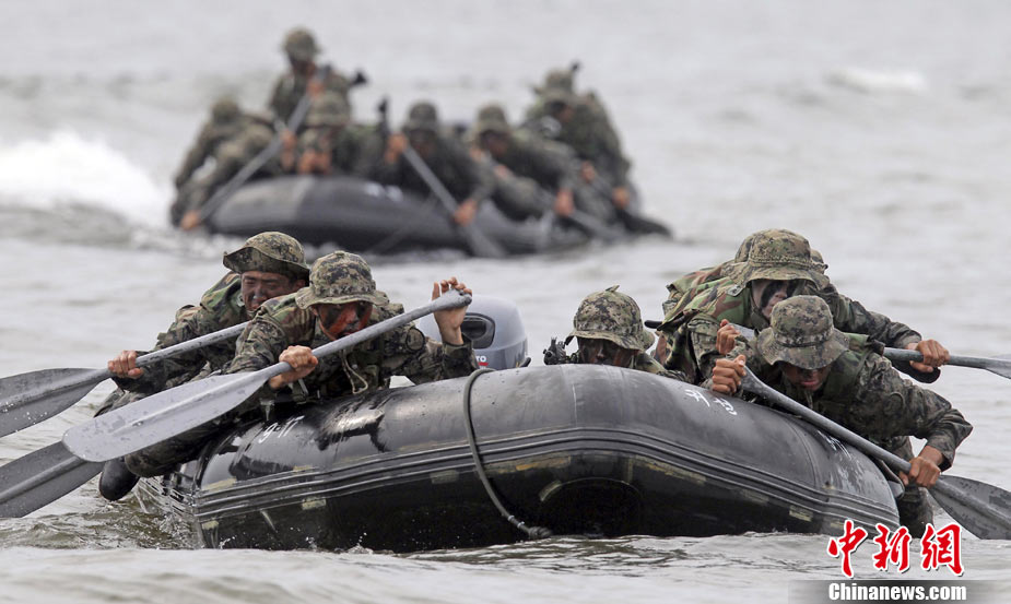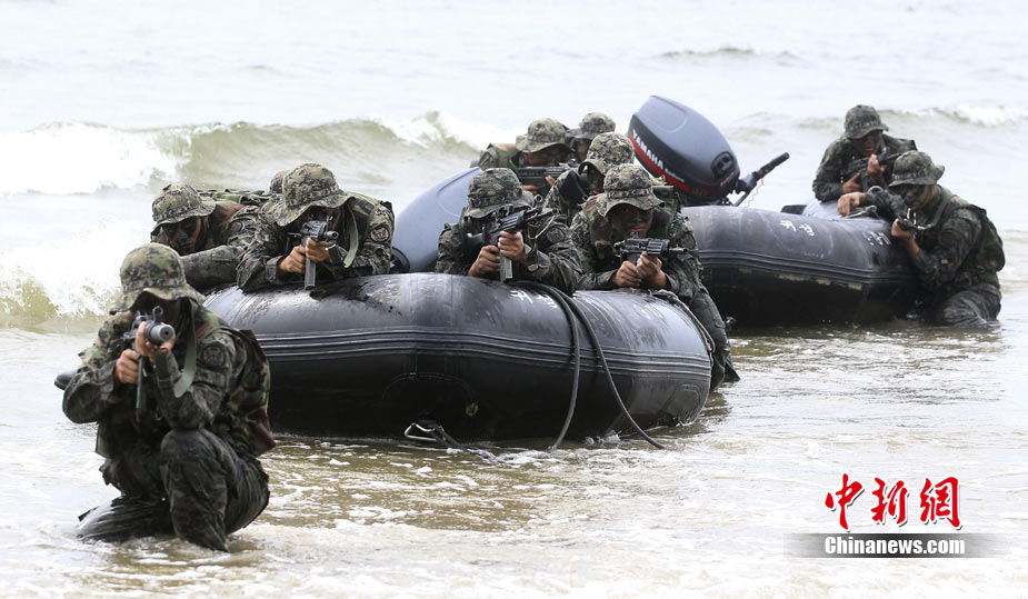 8月12日,韩国泰安郡安眠岛,韩国陆军特种部队在海滩上进行训练。