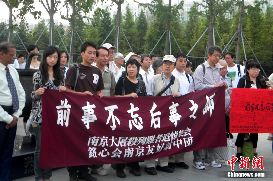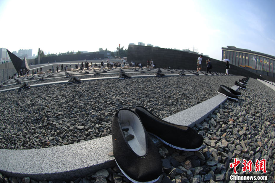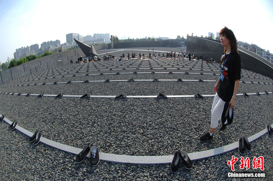 为纪念二战期间在日本遇害的6830名被强掳的中国劳工,8月14日下午,在侵华日军南京大屠杀遇难同胞纪念馆广场,被掳劳工中的幸存者及遇难者家属、日本友人等近50人举行了6830双布鞋摆放活动。中新社发 江法 摄 图片来源:cnsphoto