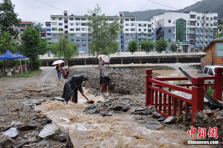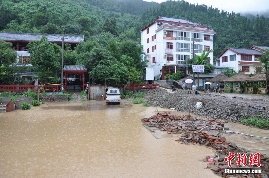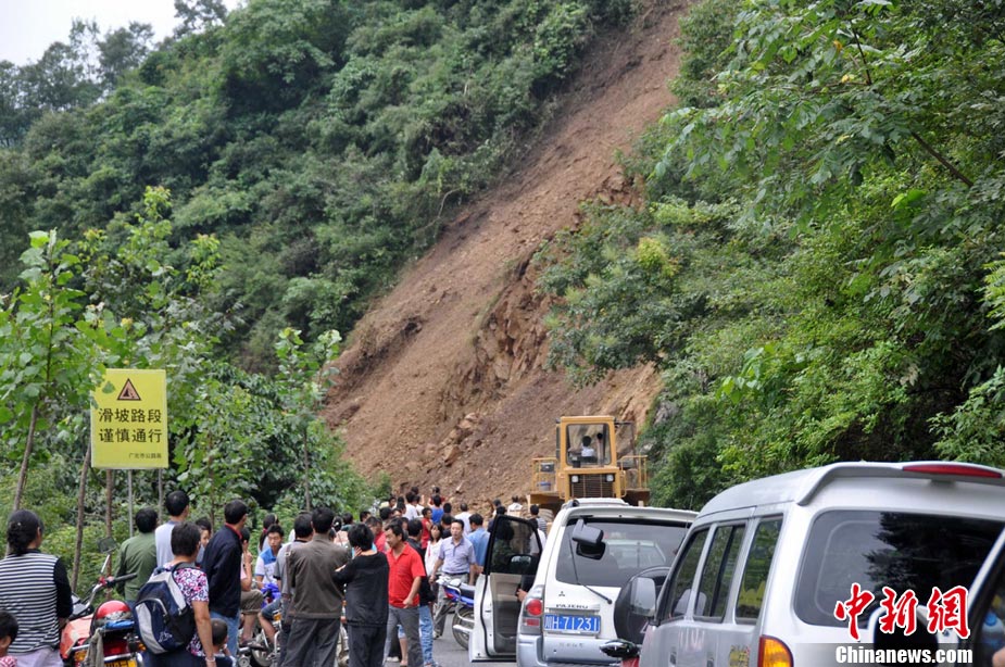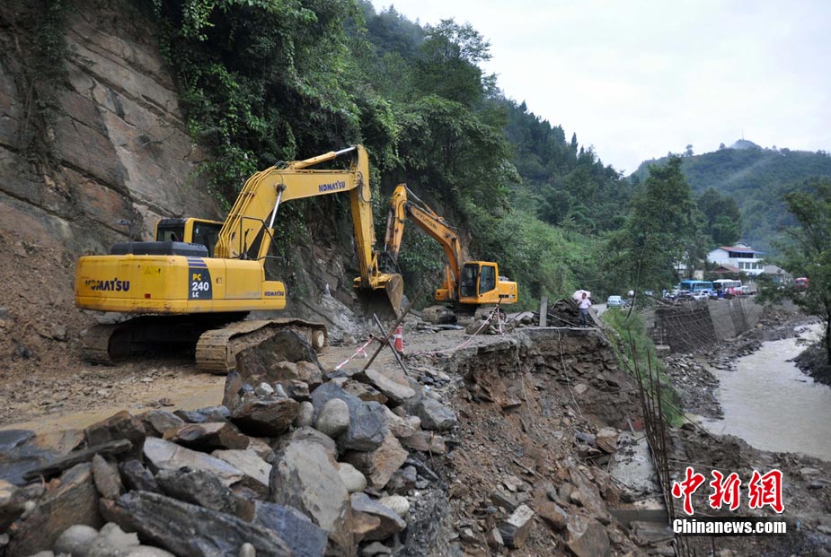 8月18日16时,四川省青川县城前往蒿溪乡的道路由于暴雨造成塌方,导致道路中断,车辆通行受阻。现场由于再次出现大量山体垮塌,部分路段抢险工作被迫停止。中新社发 刘忠俊 摄