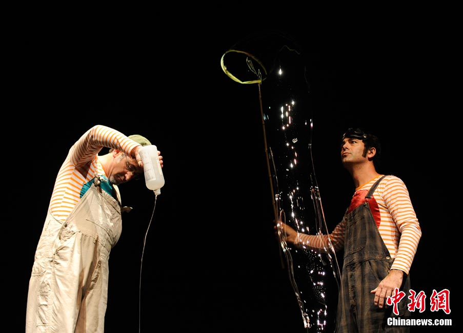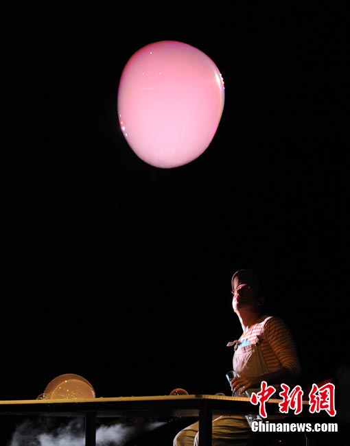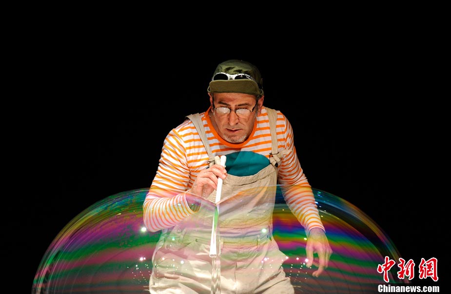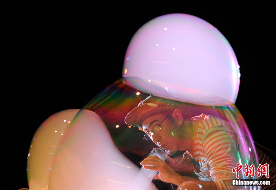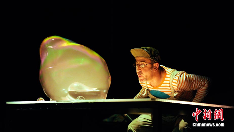 当地时间8月18日,西班牙马德里,艺术家 Luis Bevia在舞台上大耍“肥皂泡魔术”。