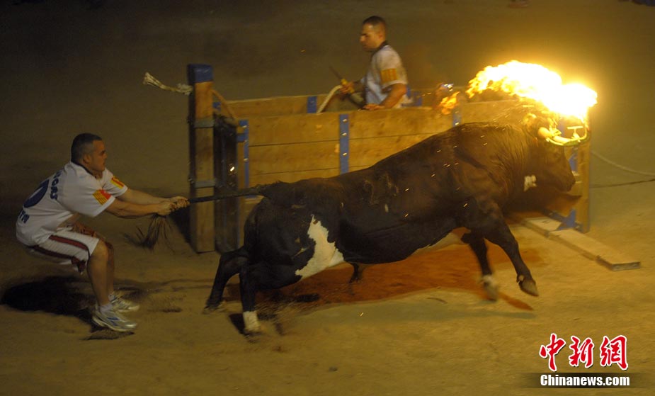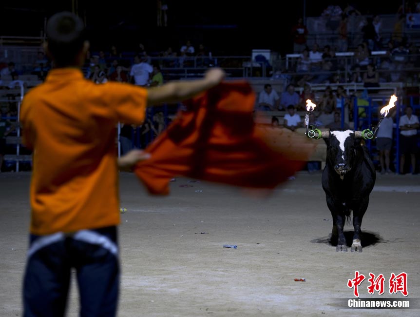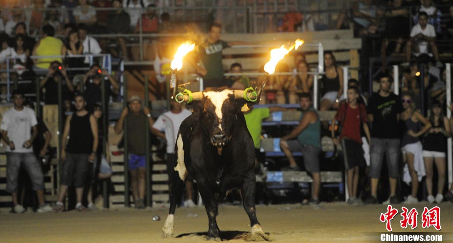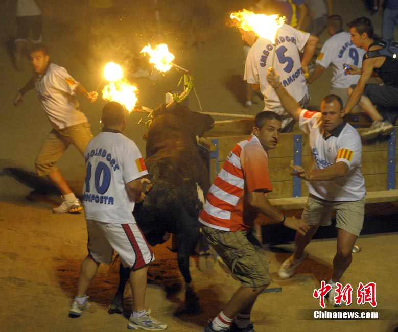 近日,在西班牙安波斯塔市,举行“奔火牛”活动。“奔火牛”是西班牙东部地区的传统节日庆典活动。在活动中,公牛的犄角被绑上火把满场飞奔,场面惊险刺激。