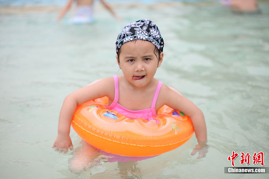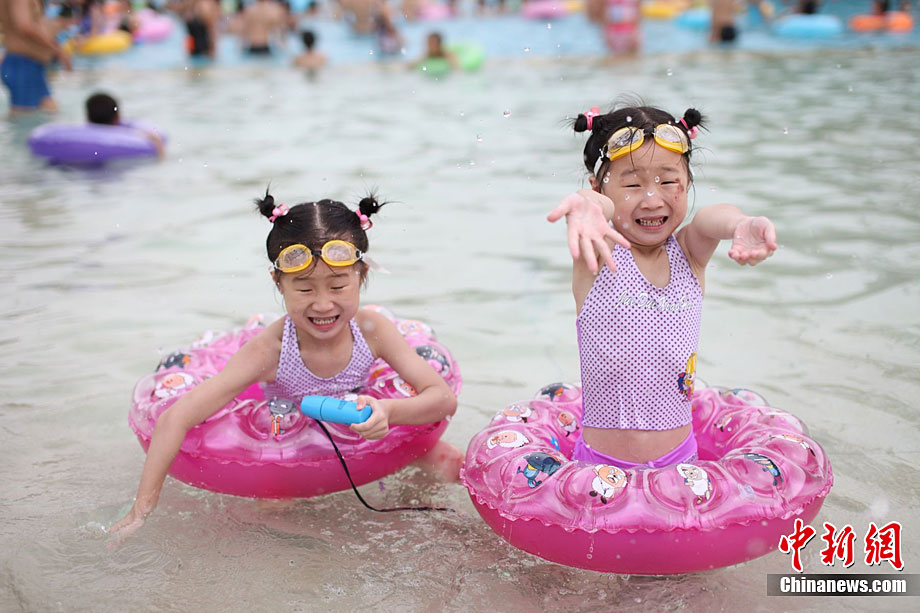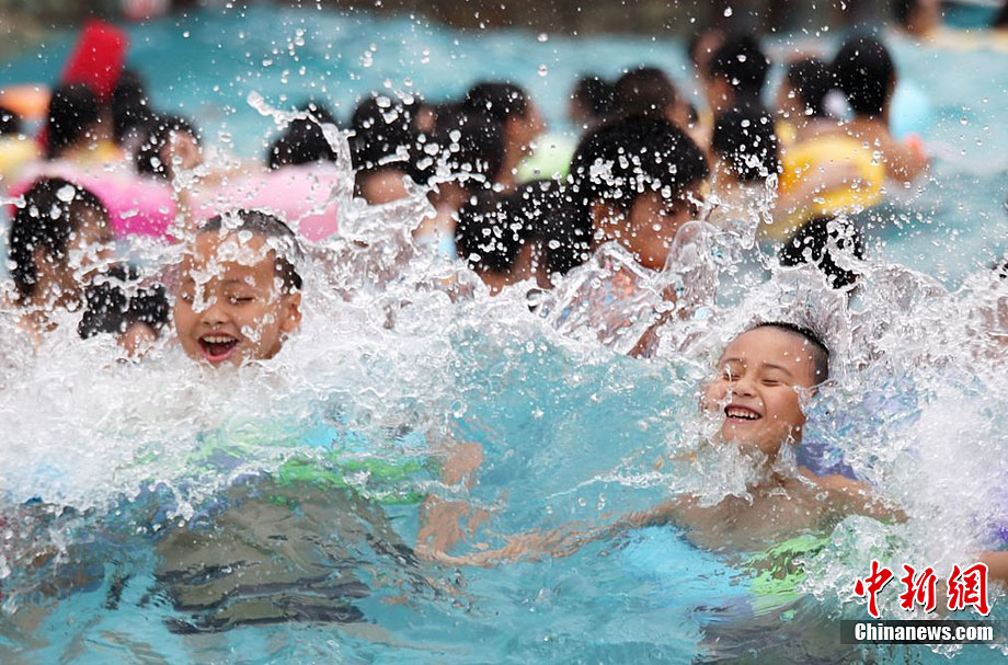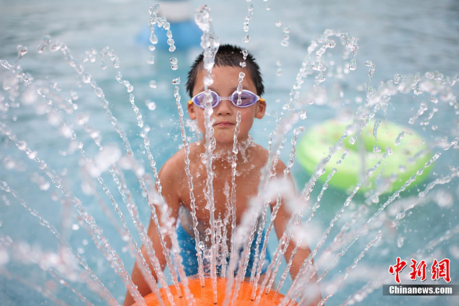 8月19日,重庆再发高温橙色预警,预计23日以前该市将连晴高温。为寻凉爽,一小孩趴在喷水孔附近感受水喷全身的清凉。刘函冉 摄