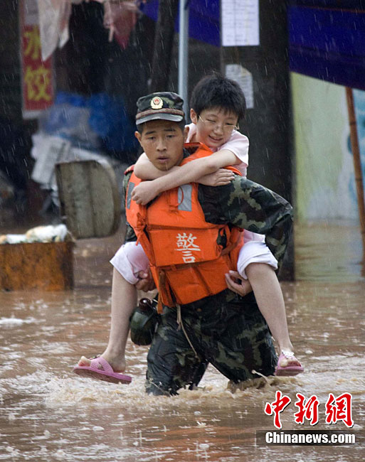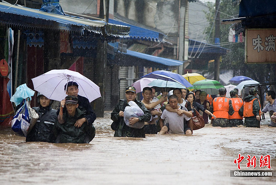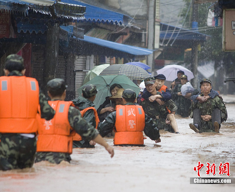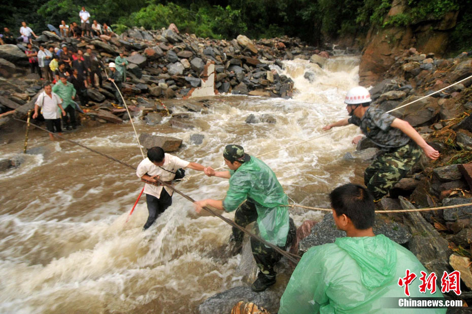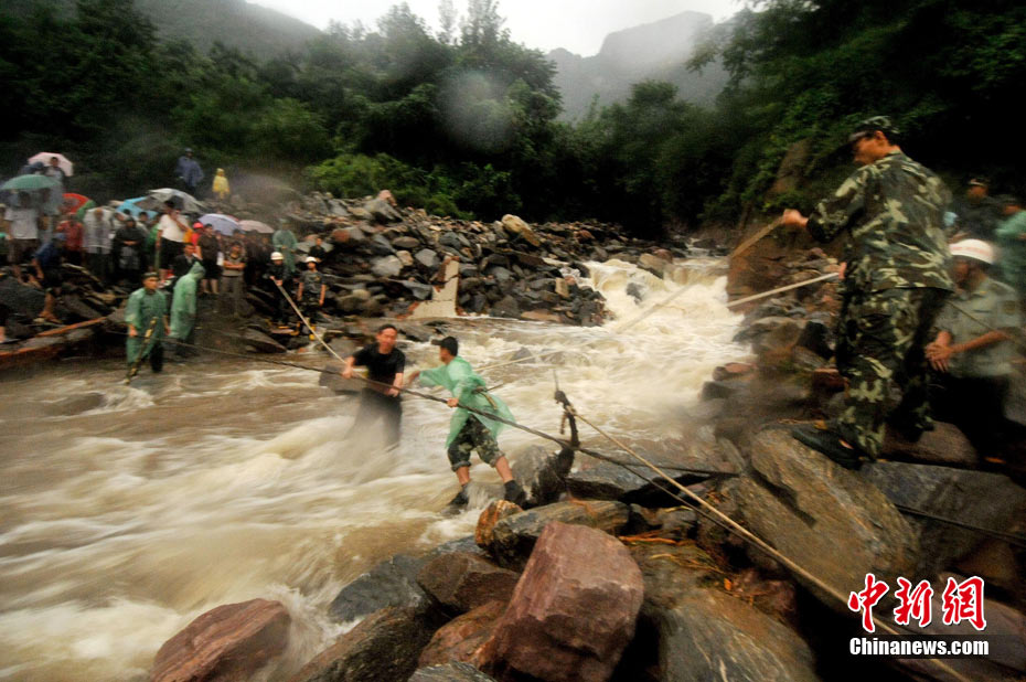 8月19日,河南省新乡市辉县市上八里镇回龙村因桥梁被山洪冲塌造成民众被困。截止19日21时30分许已经营救出被困民众80多人。但据被救人员反映,仍有40多人被困在更深处的山里。图为消防官兵正加紧营救。 中新社发 河南消防 摄