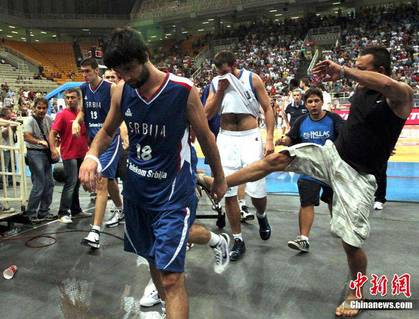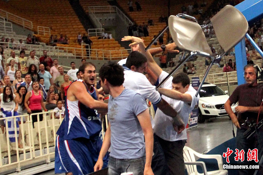 8月19日,在希腊举行的雅典卫城篮球四国赛中,塞尔维亚队与希腊队爆发冲突,裁判提前宣布比赛结束。图为塞尔维亚队球员克尔斯蒂奇(左)将椅子扔向希腊队球员布鲁西斯。