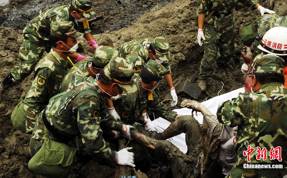 8月18日临晨1点半左右,云南省怒江傈僳族自治州贡山县普拉底乡发生特大山洪泥石流自然灾害。目前,各项救援工作正有序展开。图为8月21日中午,搜救队员在灾害现场挖出一具遇难者遗体。中新社发 田洪 摄