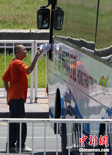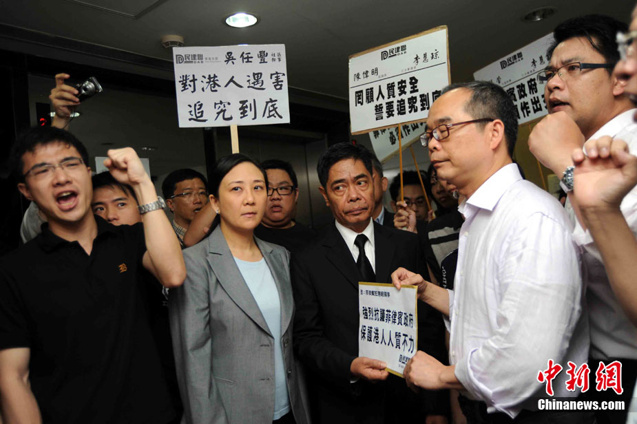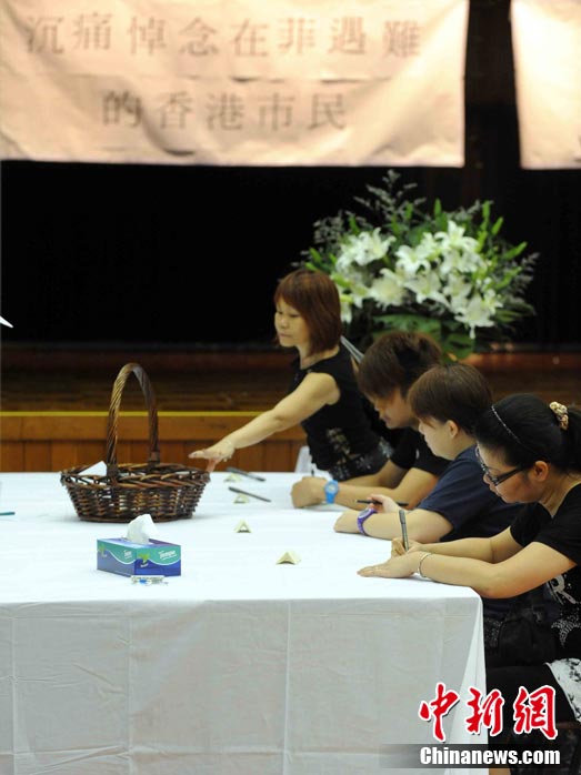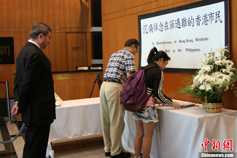 8月25日早上,市民在葵芳社区会堂的吊唁处签署吊唁册。香港民政事务总署于24日傍晚至26晚在全港18区设吊唁册,供市民悼念菲律宾人质事件中的遇难港人。 中新社发 谭达明 摄