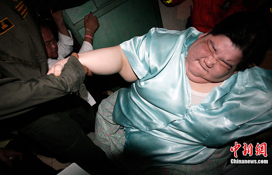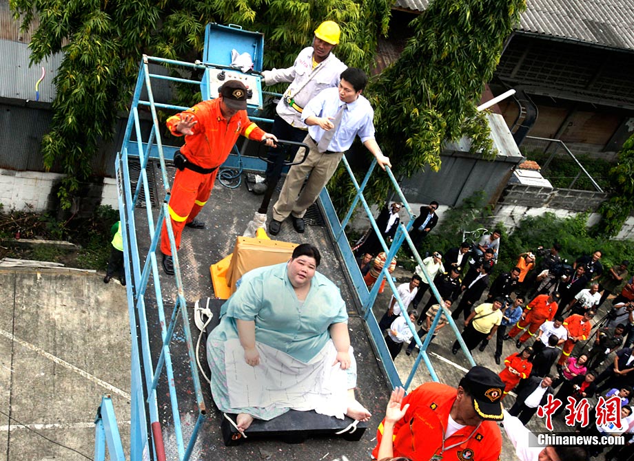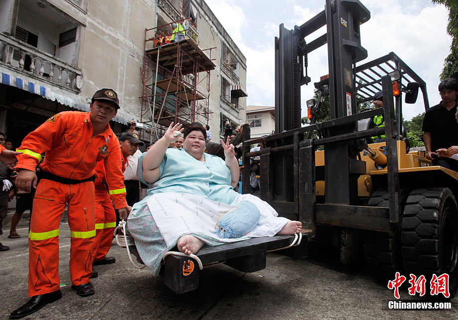 泰国最胖的女子乌努埃蓬(Umnuayporn Tongprapai)于当地时间8月26日在政府派遣的由工程师、拆卸专家、救援队、医生和护士组成的救援团队帮助下“走”出三年未曾离开的住所。44岁的乌努埃蓬住在泰国首都曼谷的郊区,她的体重高达274公斤,被认为是泰国最胖的人。