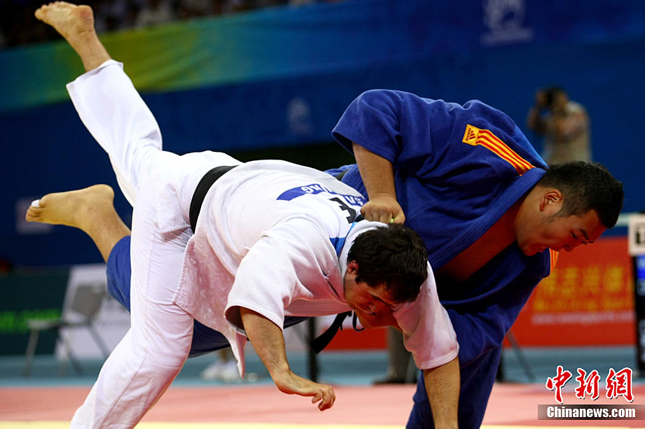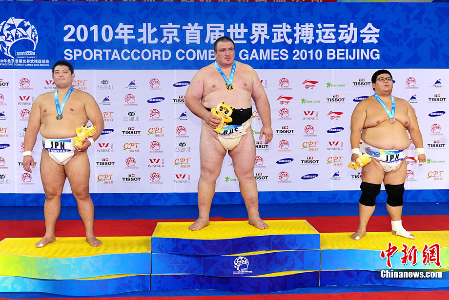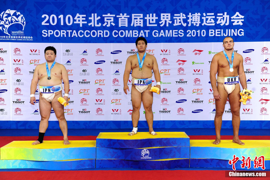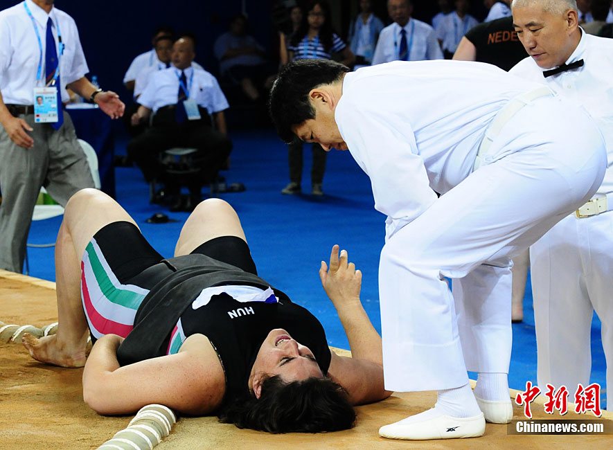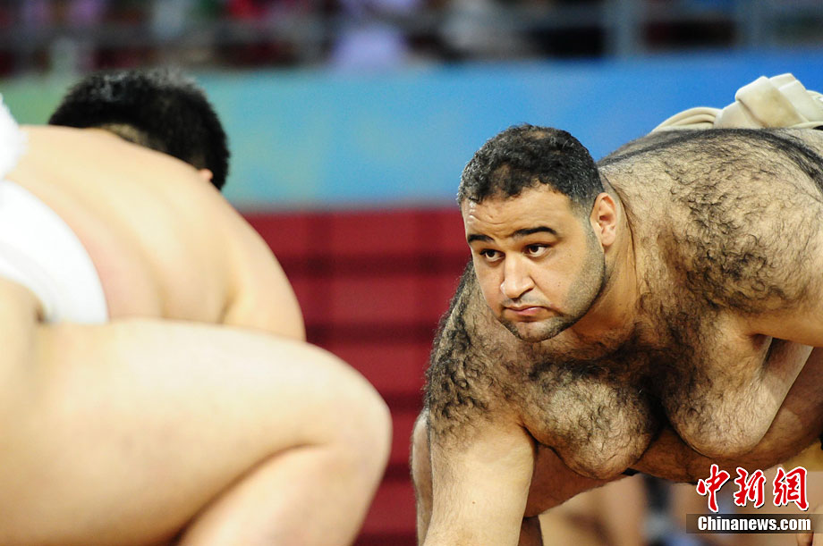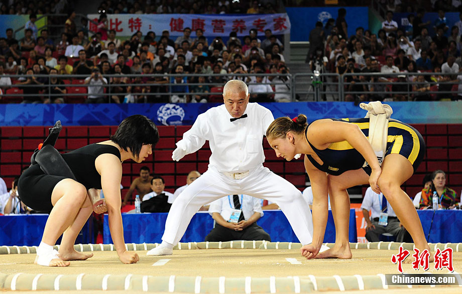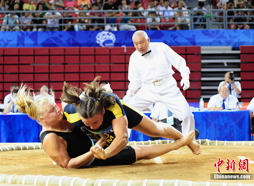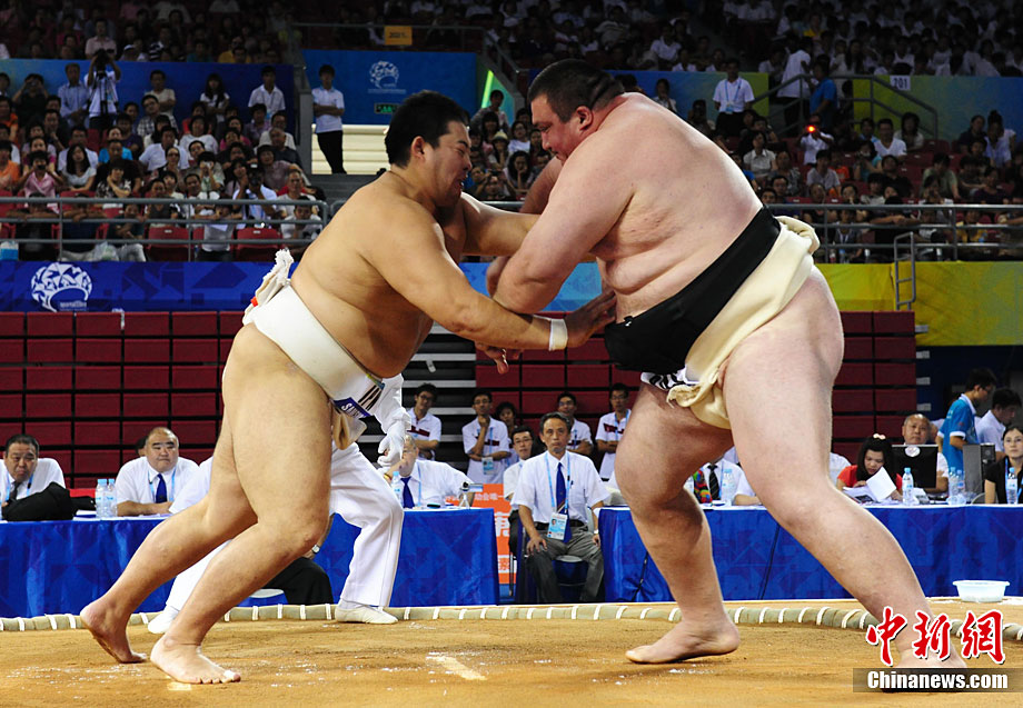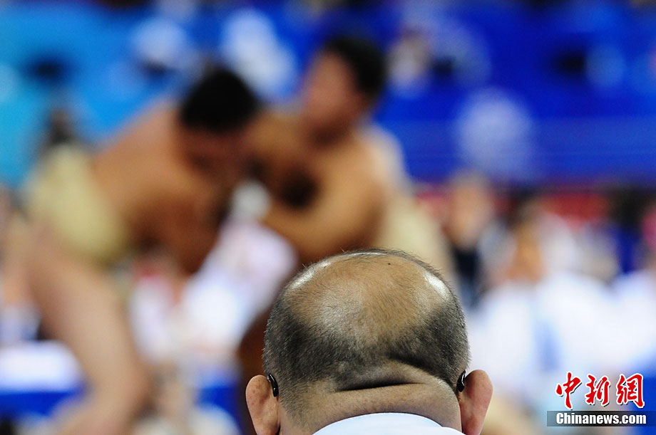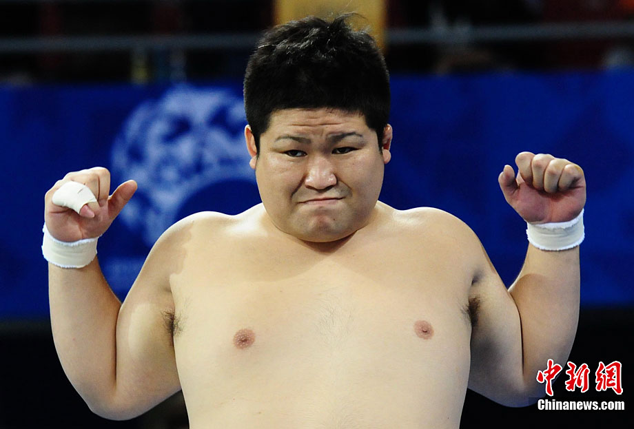8月28日下午,首届世界武搏运动会相扑比赛在北京中国农业大学体育馆拉开帷幕。相扑比赛为期两天,男女各设轻、中、重量级和无差别级,将分别决出金银铜牌。中新社记者 侯宇 摄