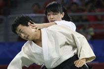 8月28日下午,首届世界武搏运动会相扑男子中量级比赛在北京中国农业大学体育馆结束,日本选手伊藤亮(中)获得冠军、日本选手吉田龙夫(左)获得亚军、乌克兰选手叶夫根·克孜利亚丁获得第三名。中新社记者 侯宇 摄