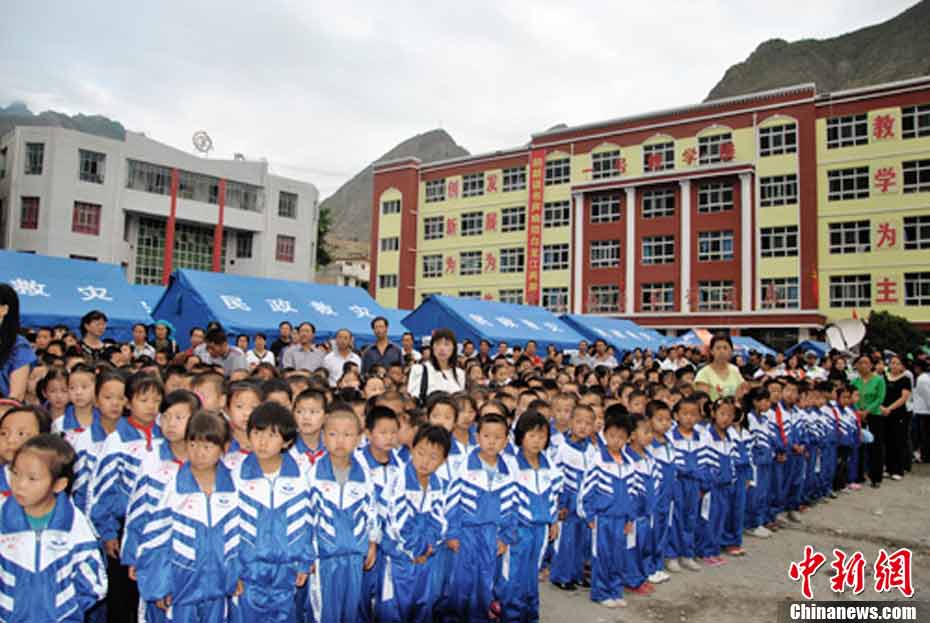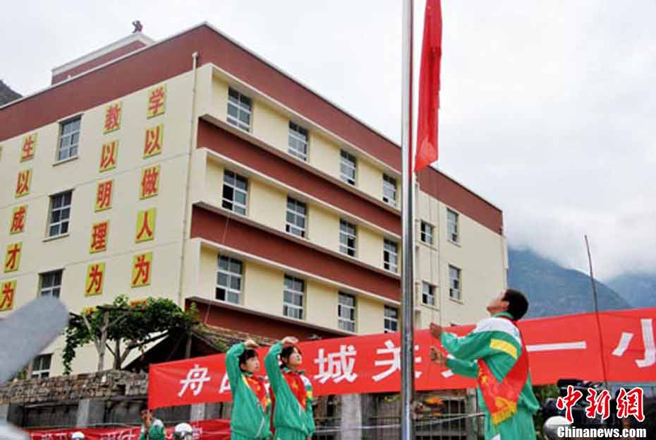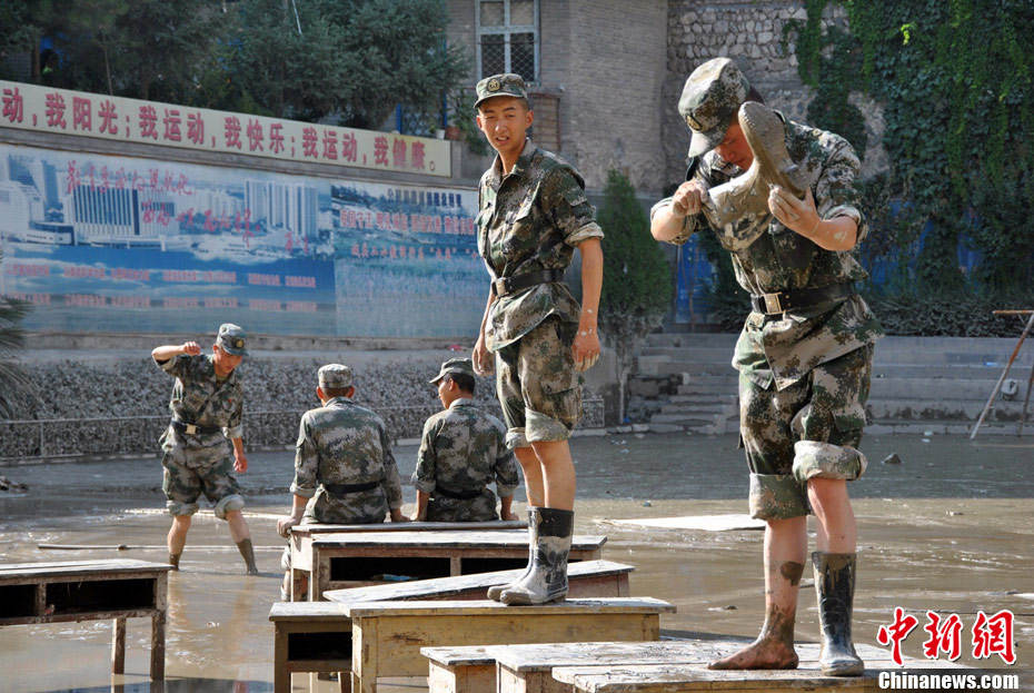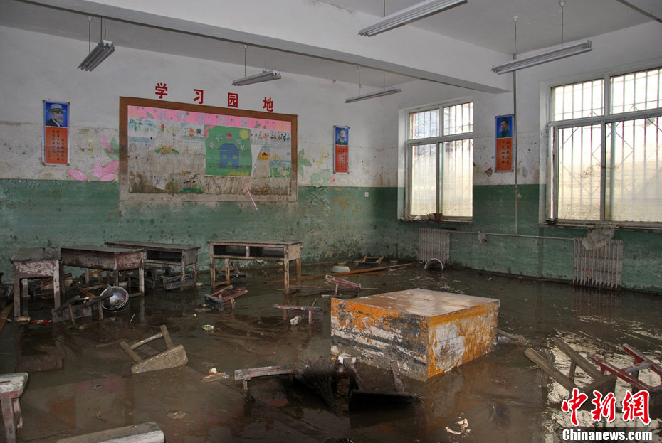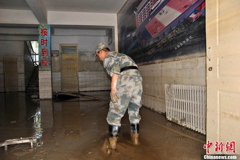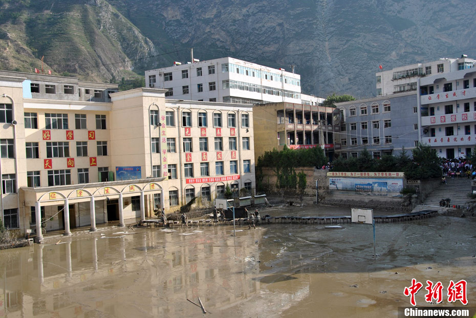 近日,随着河道清淤工作的进展,白龙江水位明显下降,舟曲城关二小被淹的教学楼逐渐露出面目。图为水位消退后的城关二小。中新社发 马晓俊 摄