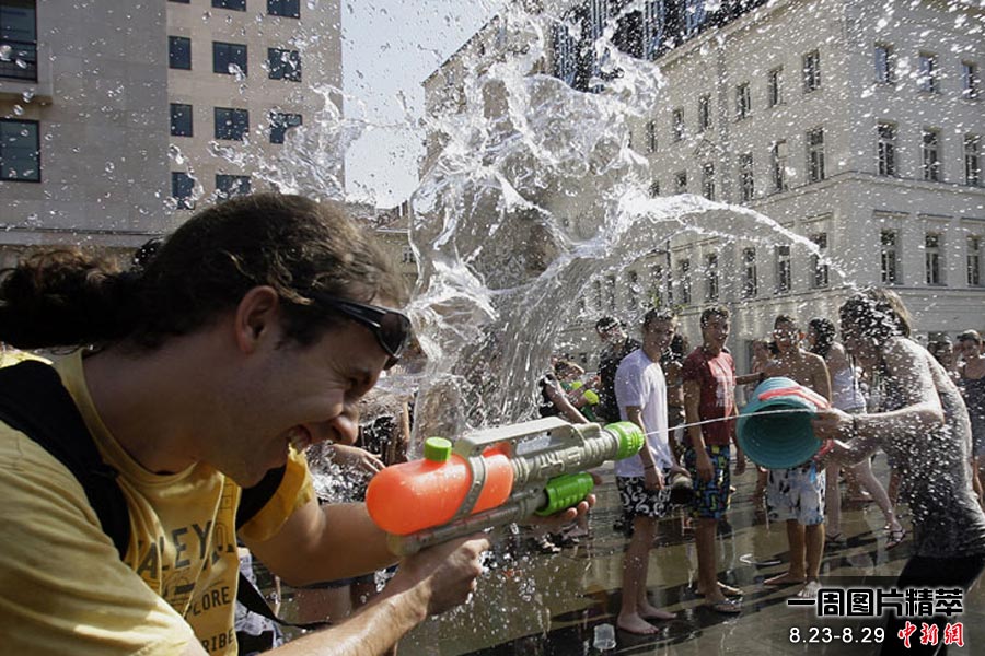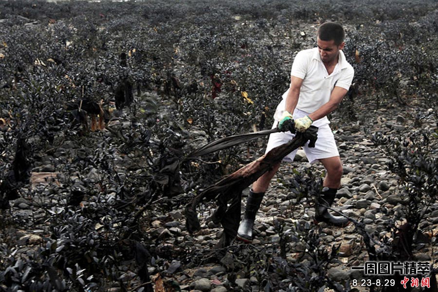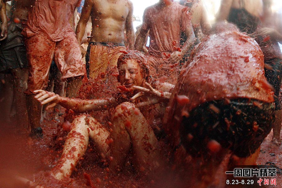 西班牙布尼奥尔小镇举行一年一度的西红柿节,成千上万来自世界各地的人们慕名前往。图为一名男子躺在西红柿果浆中。