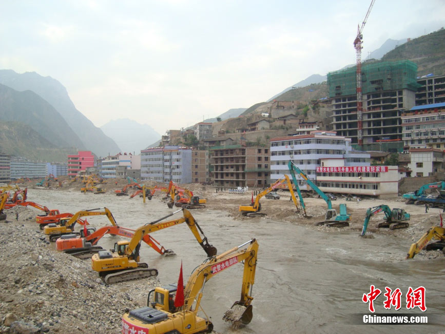 8月30日,舟曲白龙江堰塞湖应急排险和河道应急疏通任务,比预定时间提前12小时全面完成。这是解放军副总参谋长章沁生30日15时在舟曲白龙江城江桥头召开的新闻发布会上,向社会公布的。章沁生在发布会上说,到30日12时,城江桥至城关桥段水位已回落至省道313线最低点,城区积水全部回流归槽,标志着舟曲白龙江堰塞湖应急排险和河道应急疏通任务全面完成。舟曲特大山洪泥石流灾害发生后,导致白龙江形成堰塞湖致使江水水位暴涨,舟曲县城三分之一街区被淹。武警水电部队、兰州军区工程兵某部每天出动上千官兵,大型机械百余台,先是排除了堰塞湖溃决险情,从13日转入河道应急疏通任务,24小时持续奋战,终于提前完成了这一艰巨任务。图为在舟曲县城江桥上游河段,解放军和武警部队昼夜不停对河道进行除险清淤。 中新社发 郭海勇 摄