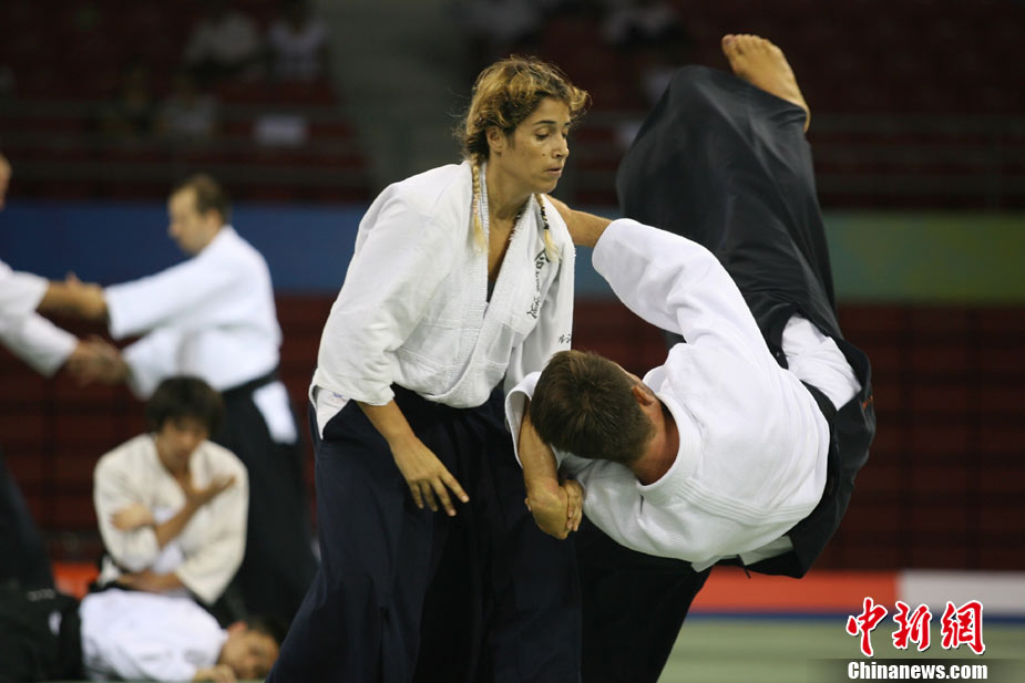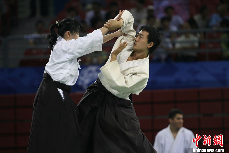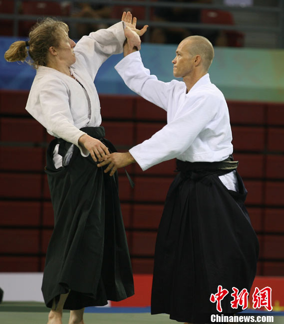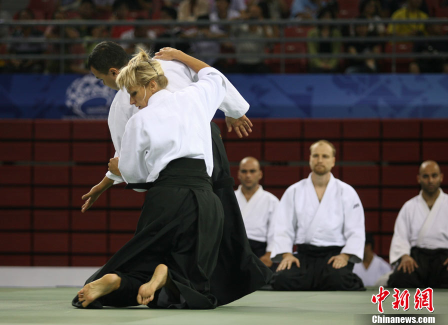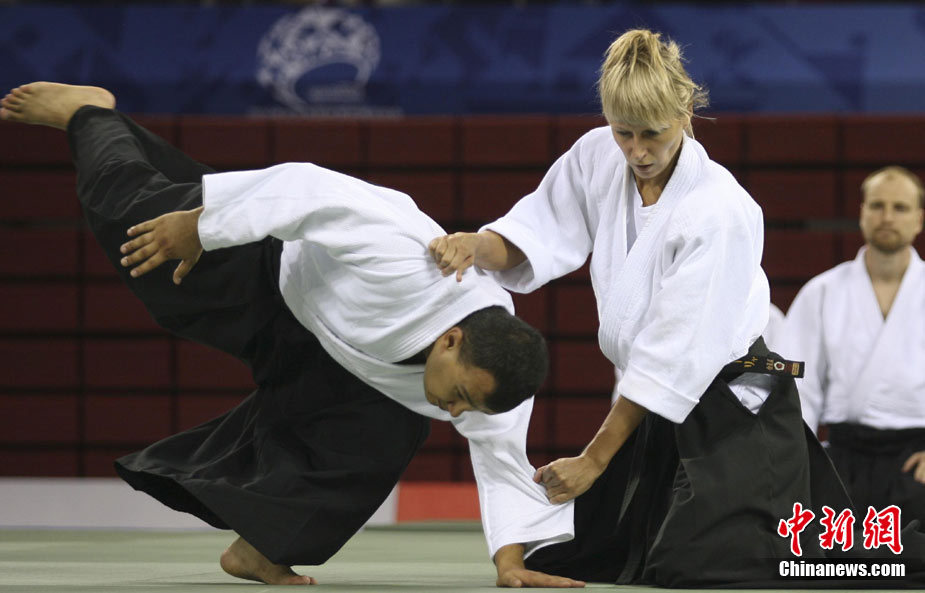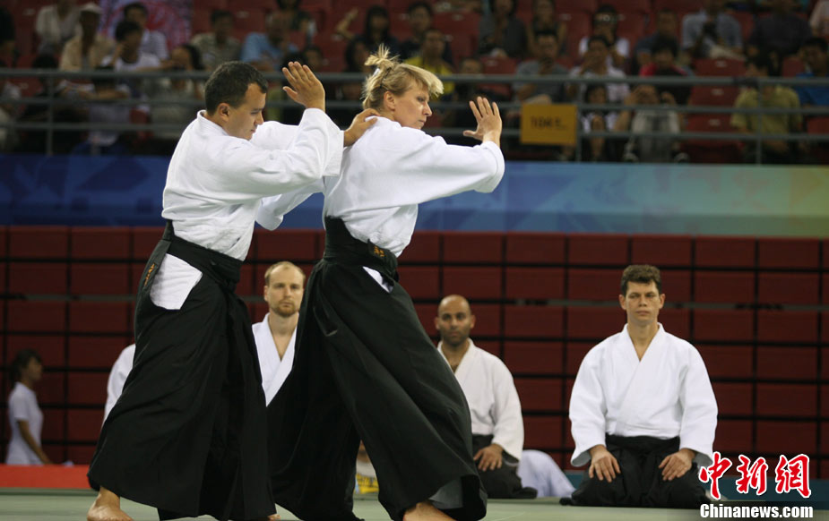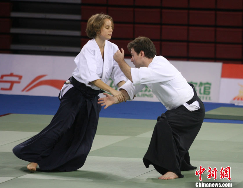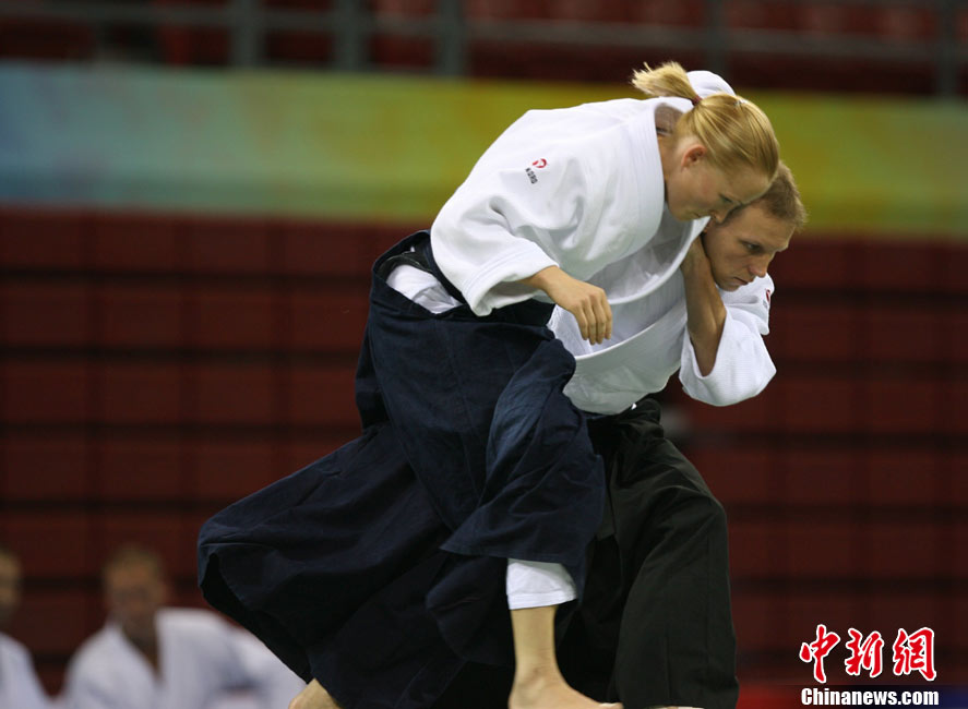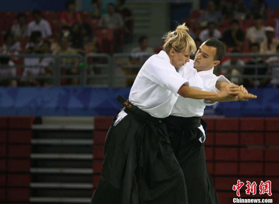 8月30日,男女选手在北京武搏会合气道比赛上演了“异性对决”。合气道是一种根源于日本大东流合气柔术的近代武术,合气道不注重比赛的胜负,没有跟别人较量的思想,而是跟他人一起锻炼和修养自己,因此才会有鲜见的异性同场对决的场面出现。本次武搏会,合气道将作为表演项目,无特别的规则,因此不能够严格地定义胜利者或者失败者。国际合气道联合会将组织高段教官来评判各项表演,表演赛分为基本技巧、高级技巧和复合技巧等三个单元。 中新社发 苏丹 摄