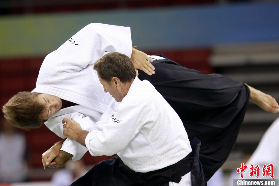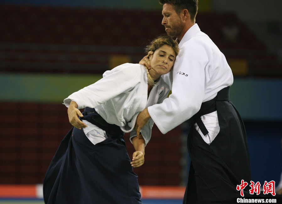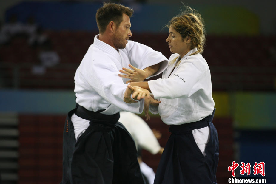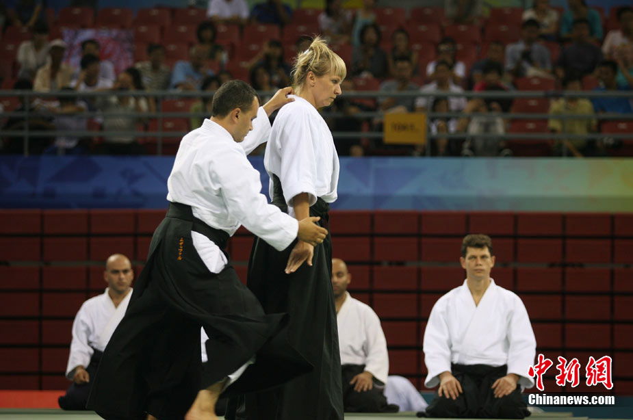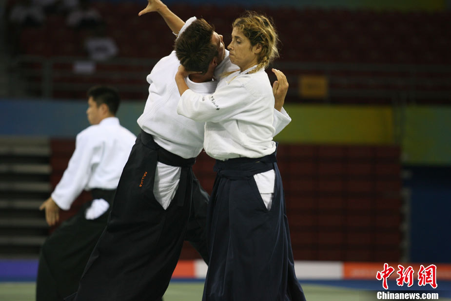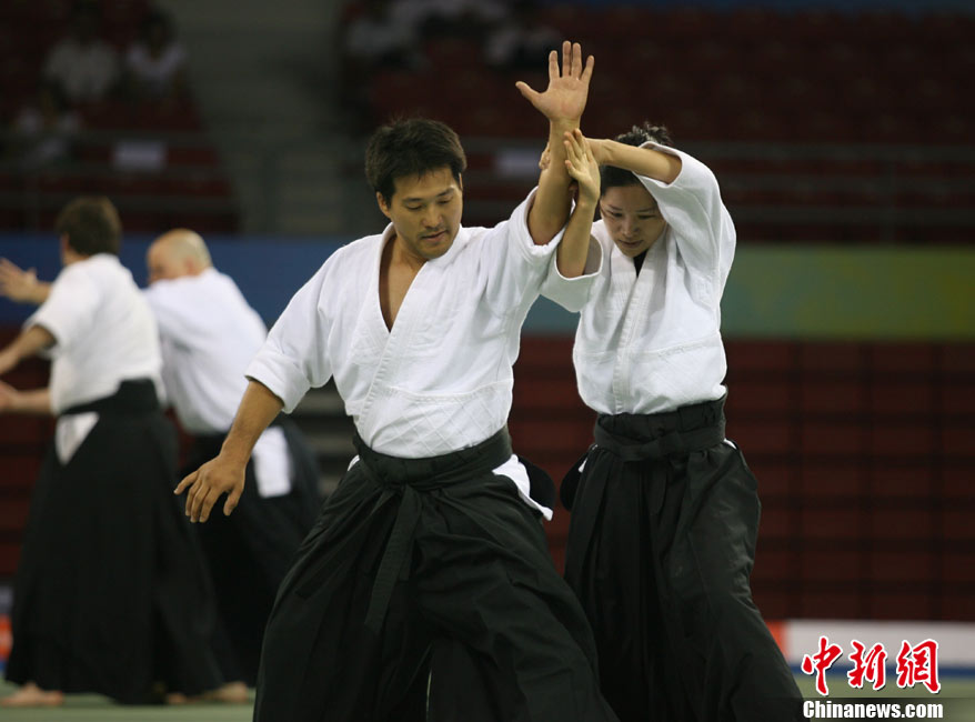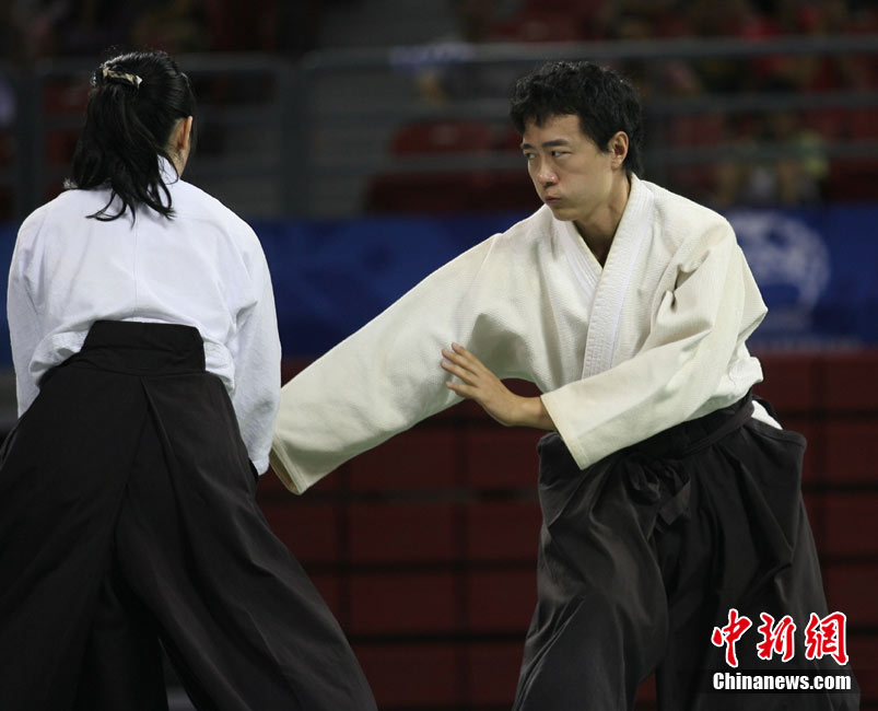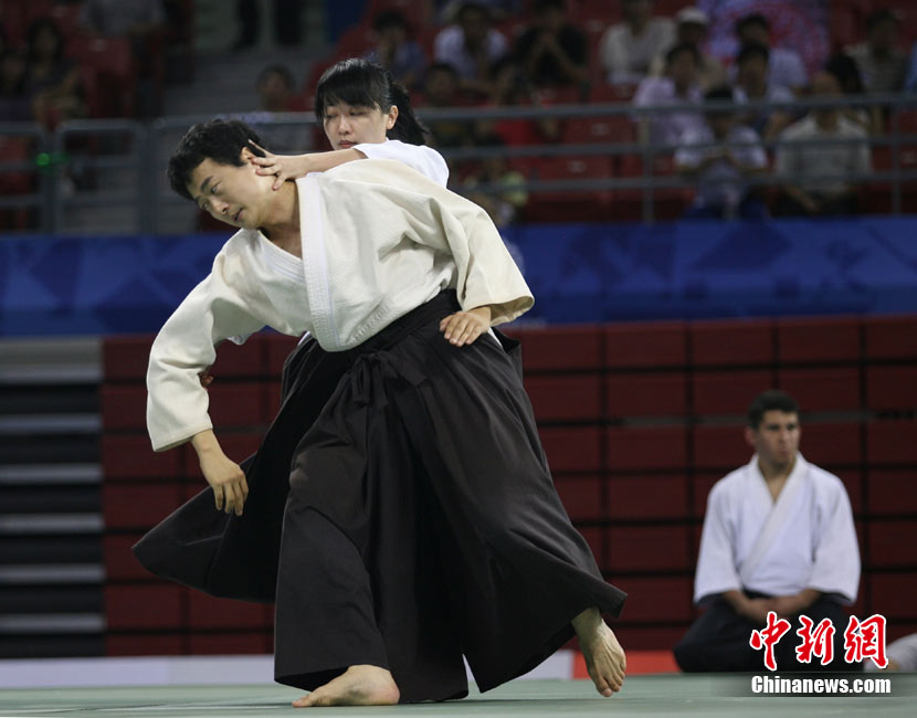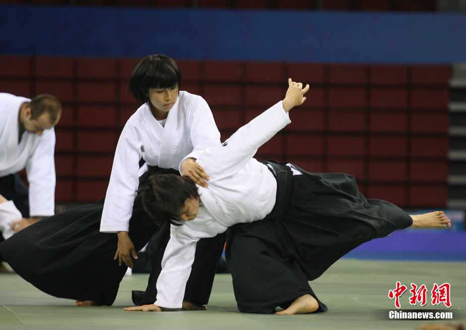 8月30日,男女选手在北京武搏会合气道比赛上演了“异性对决”。合气道是一种根源于日本大东流合气柔术的近代武术,合气道不注重比赛的胜负,没有跟别人较量的思想,而是跟他人一起锻炼和修养自己,因此才会有鲜见的异性同场对决的场面出现。本次武搏会,合气道将作为表演项目,无特别的规则,因此不能够严格地定义胜利者或者失败者。国际合气道联合会将组织高段教官来评判各项表演,表演赛分为基本技巧、高级技巧和复合技巧等三个单元。 中新社发 苏丹 摄