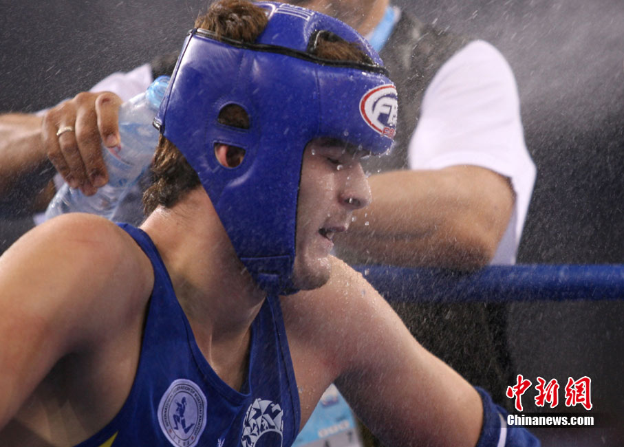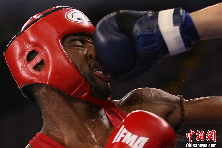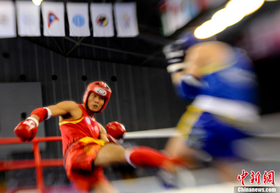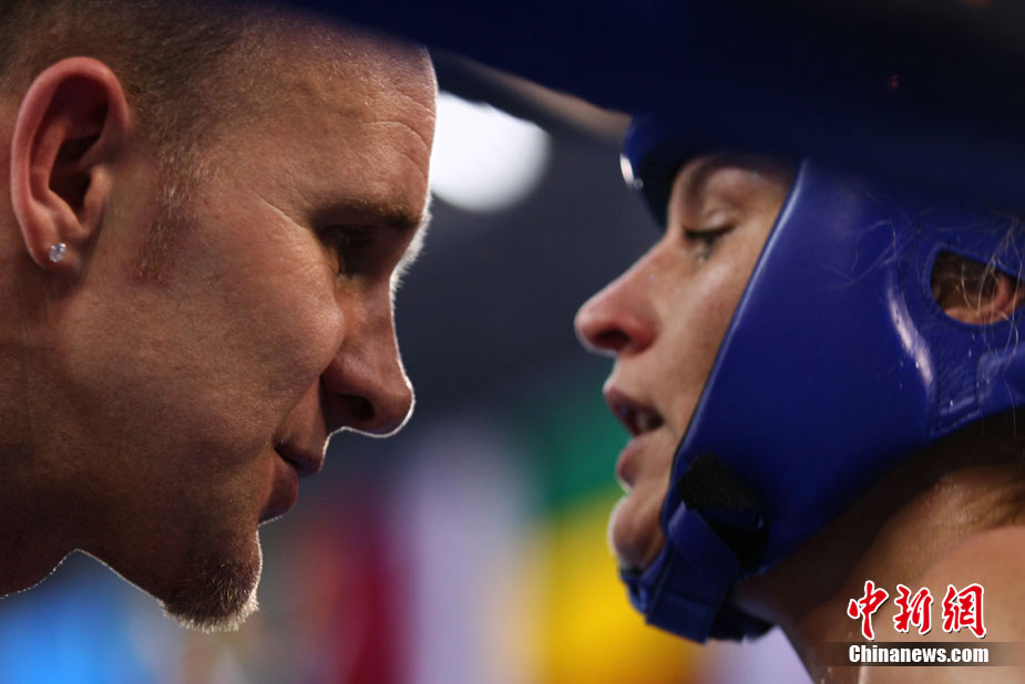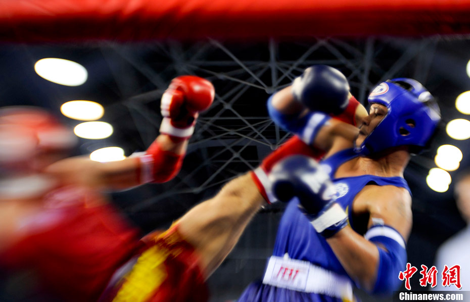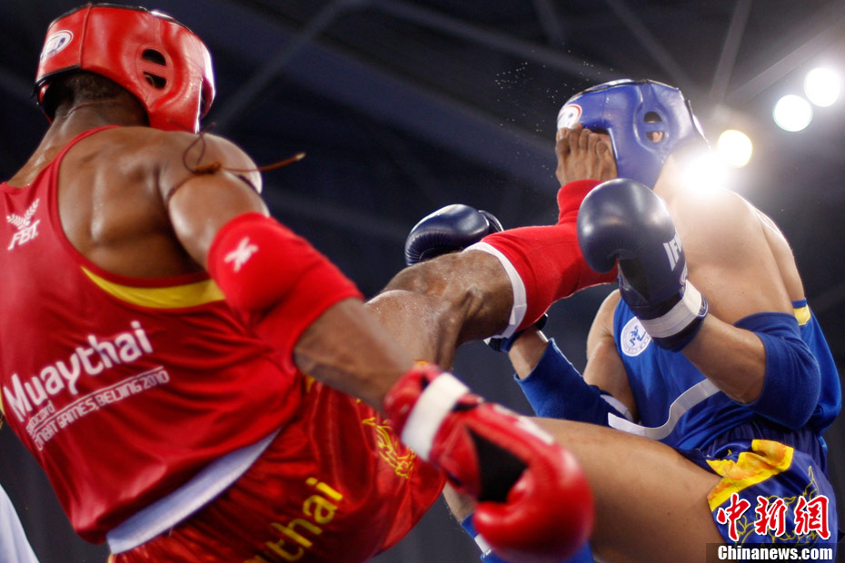 8月31日,2010年北京首届世界武搏运动会泰拳比赛在北京奥体中心体育馆进行了11个级别半决赛的较量,包括8个级别的男子半决赛和3个级别的女子半决赛。 中新社发 盛佳鹏 摄