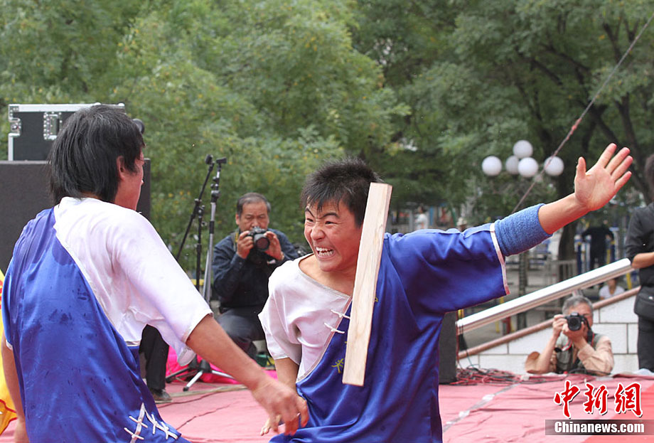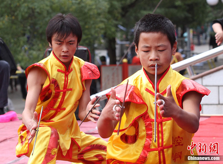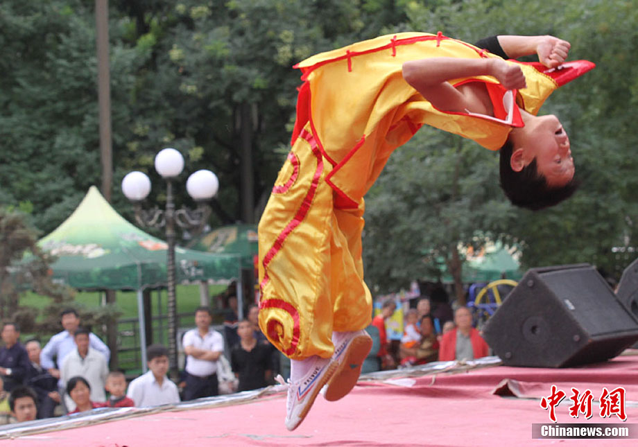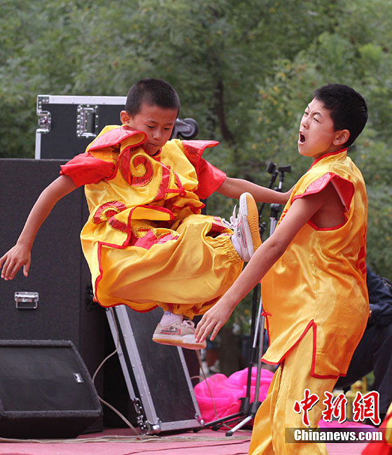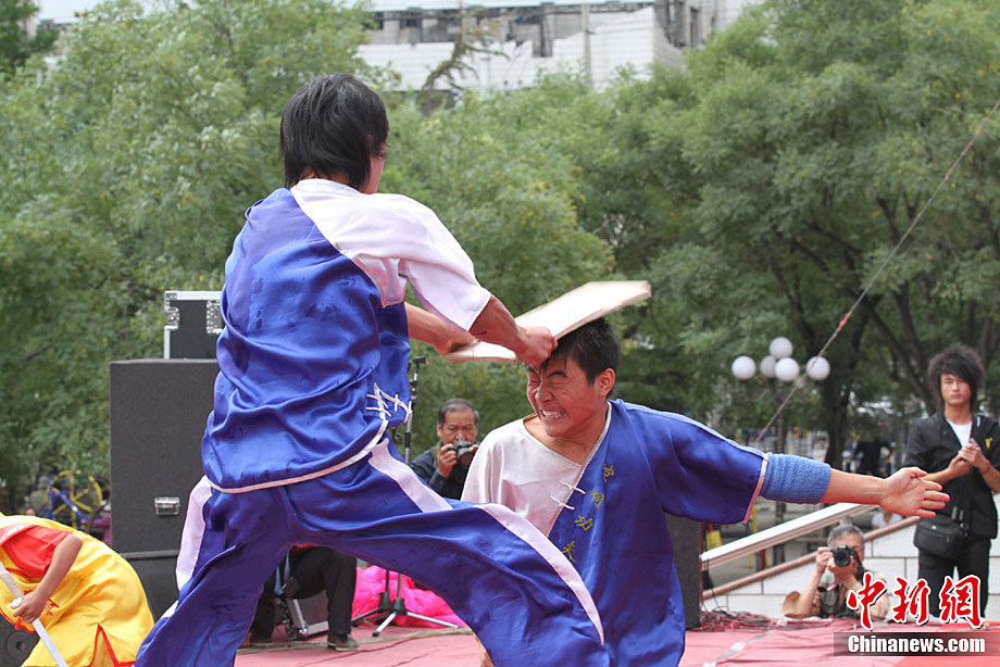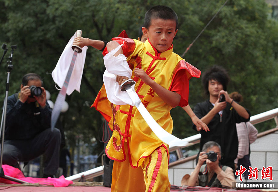 9月1日,兰州东方红广场上演一场崆峒武术秀。崆峒派武术是与少林、武当、峨嵋、昆仑齐名的五大武术流源之一,崆峒武术与道教文化紧密相连,神秘奇诡,风格独特。中新社记者 殷春永 摄