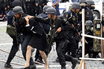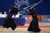 9月3日,2010年北京首届世界武搏运动会剑道比赛在北京科技大学体育馆开赛,当天举行男、女个人赛预赛和决赛及女子特殊邀请赛预赛和决赛。图为在女子个人赛中,来自韩国的全家熙(左)对阵澳大利亚选手希尔维斯特(SYLVESTER)。中新社记者 富田 摄