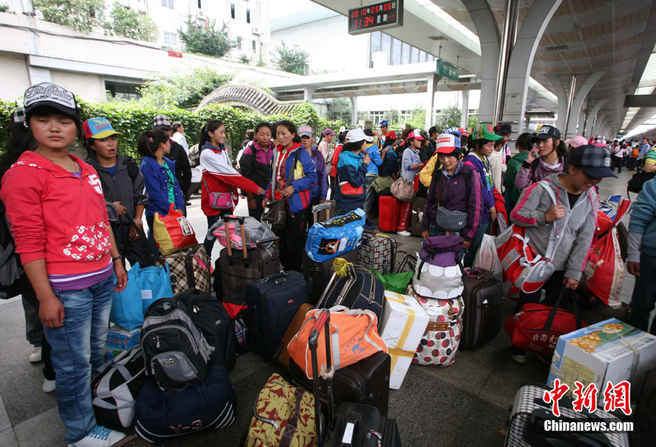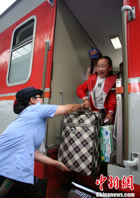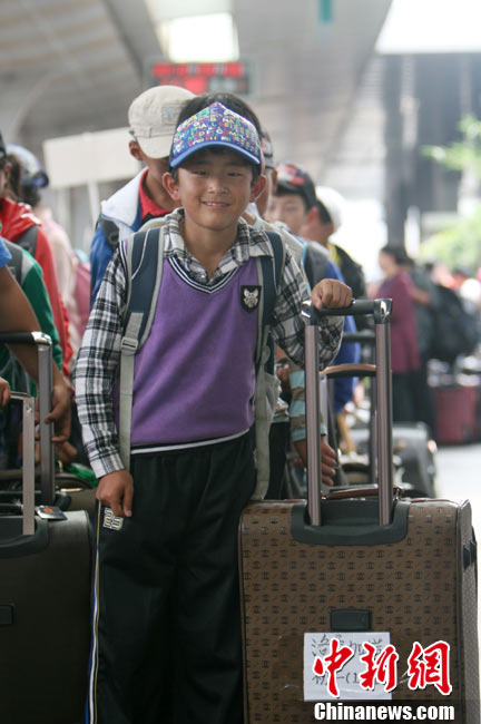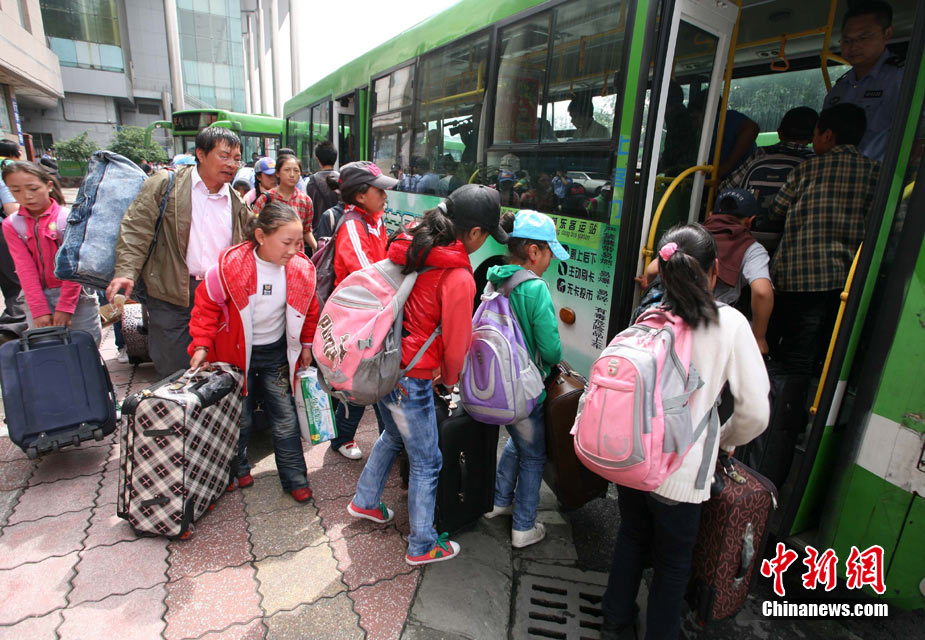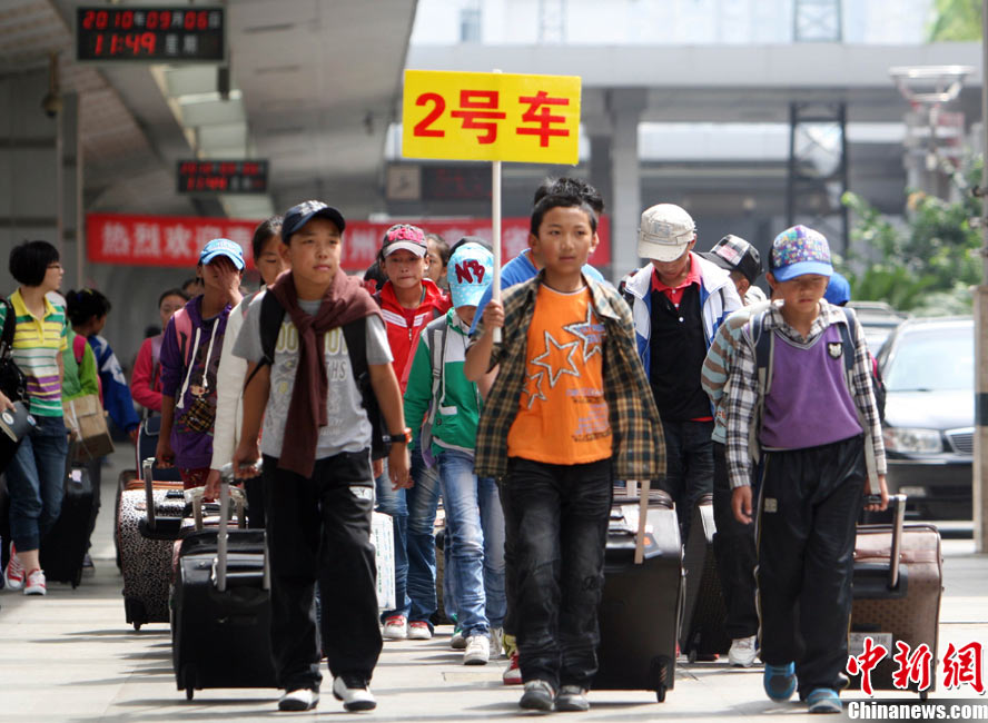 9月6日中午,青海省玉树州地震灾区民族中学2013级初一、高一486名新生经过长途跋涉安全抵达成都,他们将在四川都江堰八一聚源中学异地过渡。至此,玉树州民族中学成建制转移安置工作全部结束。图为玉树州民族中学新生抵达成都火车站。 中新社发 刘忠俊 摄