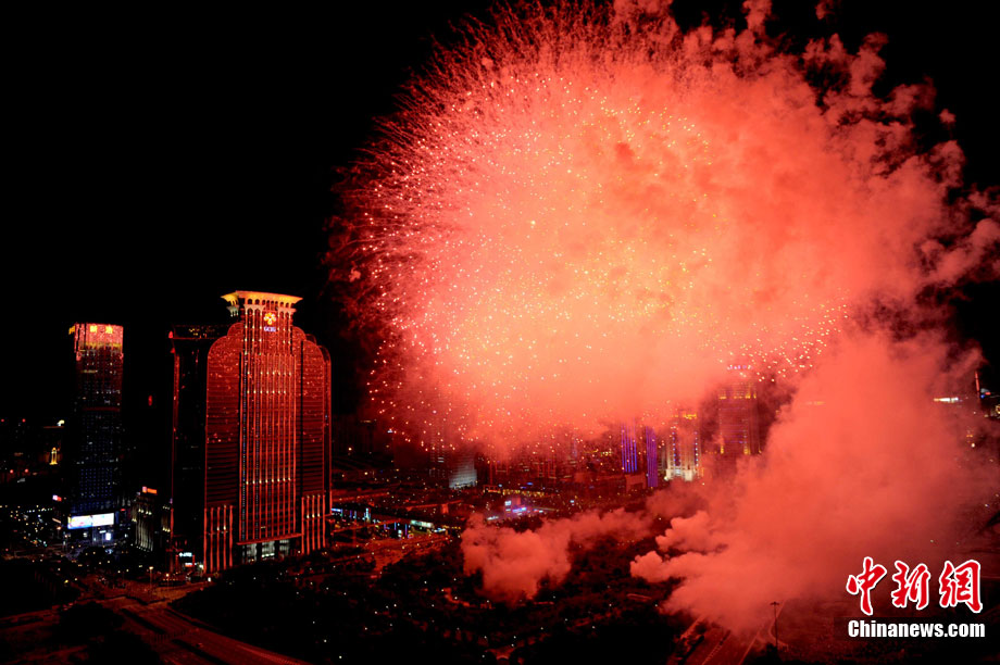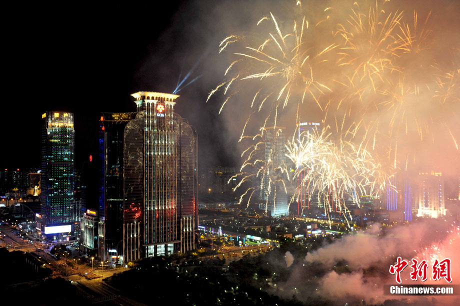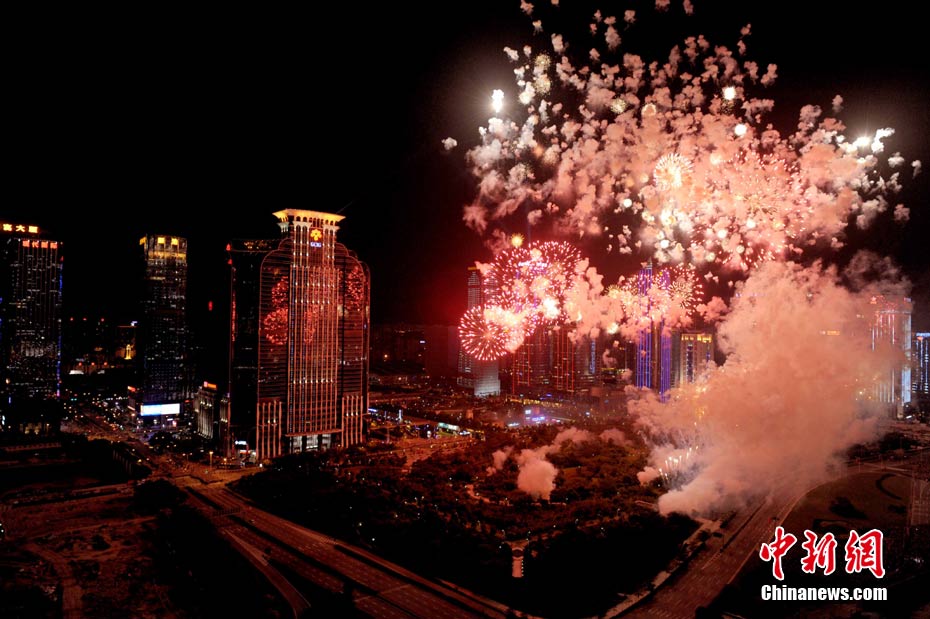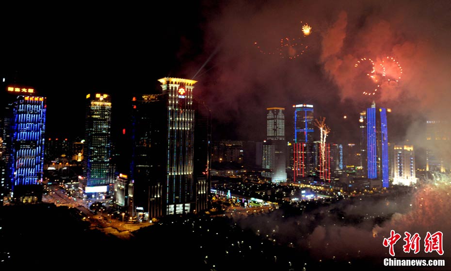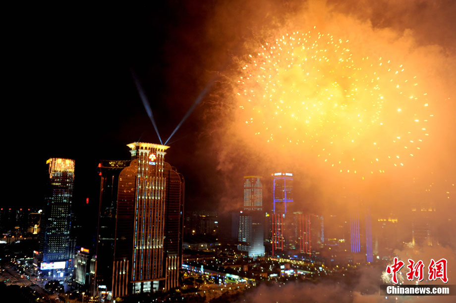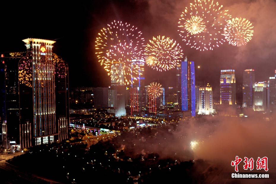 9月6日晚8点30分,深圳夜空璀璨绚丽,庆祝深圳经济特区建立30周年焰火晚会在深南大道水晶岛举行。今晚燃放烟花数量145107发,主要品种19种,全长30分钟,共四个乐章。深圳市民分别在莲花山公园、市民中心、深南路、彩田路、会展中心等区域观看深圳经济特区30周年庆典烟花晚会。中新社记者 陈文 摄