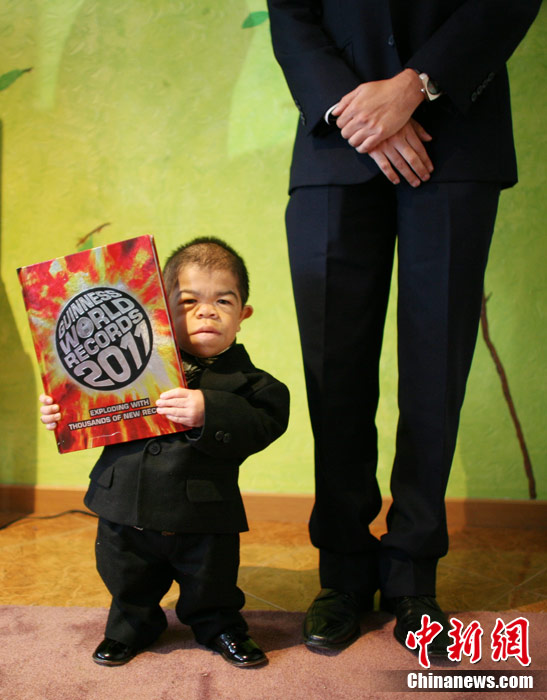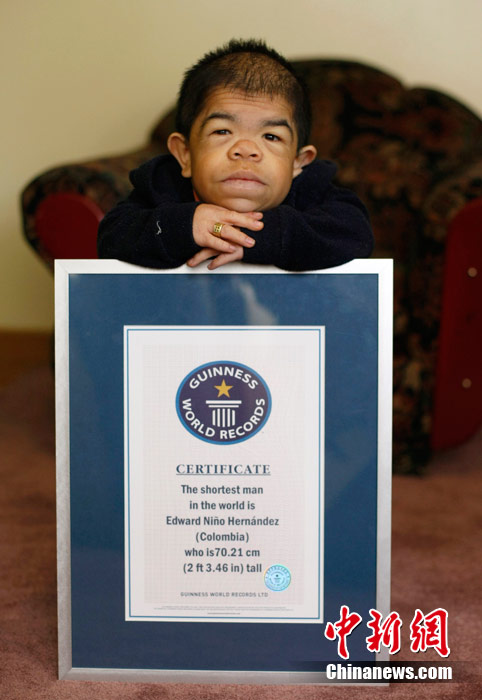 身高仅70厘米的哥伦比亚男子爱德华·尼科·埃尔南迪斯近期获得吉尼斯世界纪录世界最矮男人的称号。身高为74厘米的前吉尼斯世界纪录保持者何平平3月13日去世后,吉尼斯纪录认证官员找到了身高70厘米的埃尔南迪斯。现年24岁的他体重只有10公斤,出生时体重为1.5公斤,体长38厘米。然而,埃尔南迪斯的这个头衔不会保持太久,尼泊尔少年马加尔今年10月14日年满18周岁后,有望取代他成为世界最矮的男人,马加尔身高仅56厘米。
