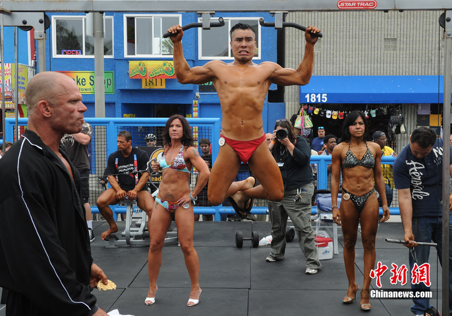 9月6日,在美国洛杉矶的威尼斯海滩,健美爱好者们参加一年一度的海滩健美锦标赛。