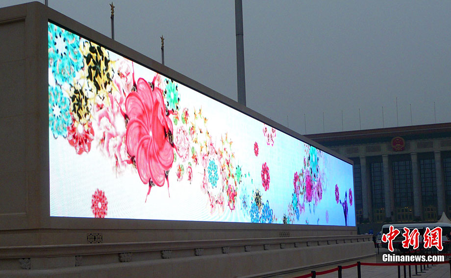 9月6日傍晚,北京天安门广场人民英雄纪念碑北侧,两块新近亮相大理石基座的LED巨屏开始调试,巨屏将以新颖靓丽的视频画面迎接国庆节的到来。据悉,原本为临时设施的这两块国内最大广场显示屏,现改造为固定设施,成为天安门广场的重要景观,此次更换新屏后,像素间距将从16毫米压缩至12毫米,画面更加清晰逼真。玉龙 摄 图片来源:cnsphoto