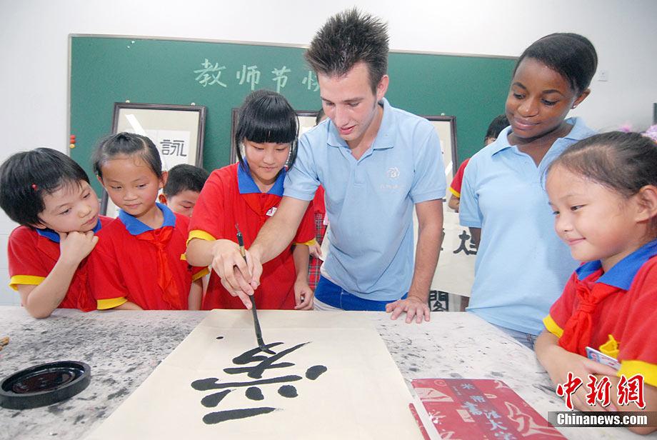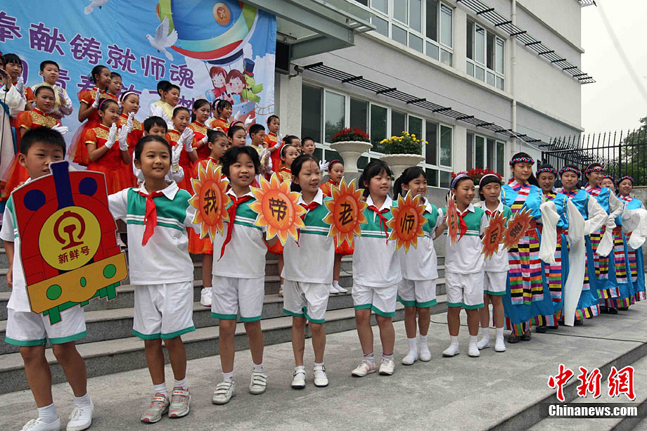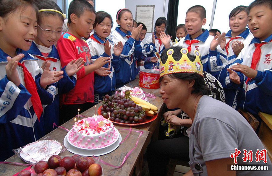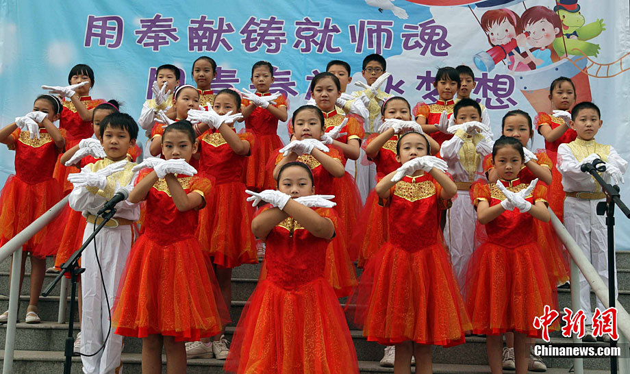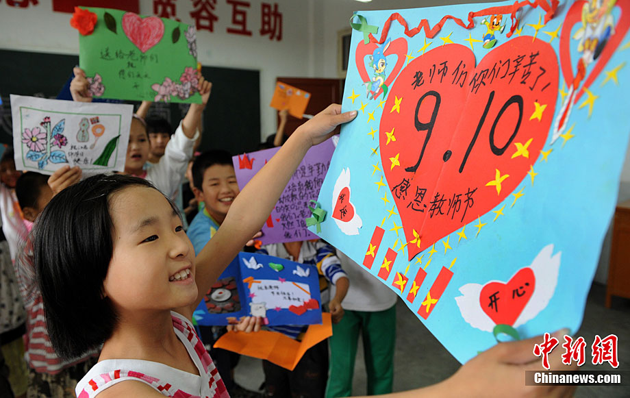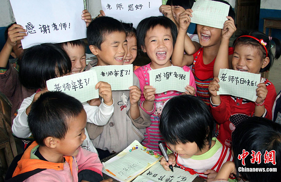 9月9日,湖南省邵阳县黄荆乡腊树村小学复式班孩子以心代礼表达对老师李真清的衷心祝愿。腊树村小学地处最为偏僻而贫困的山坳里,年生源不足30人。学生合成一个复式班,在一个教室里分上一、二年级课程。残疾人李真清独自坚守,不屈的脊梁扛起这所20几人的学校20年之久,先后使200多名失学儿童重返校园,100多名学生从这所小学走进大中专院校。在教师节到来之际,孩子们拿不出好礼物,升读异校的孩子与现复式班22名孩子分别选择打电话、写感言方式,以心代礼祝教师节日快乐。李爱民 摄 图片来源:cnsphoto