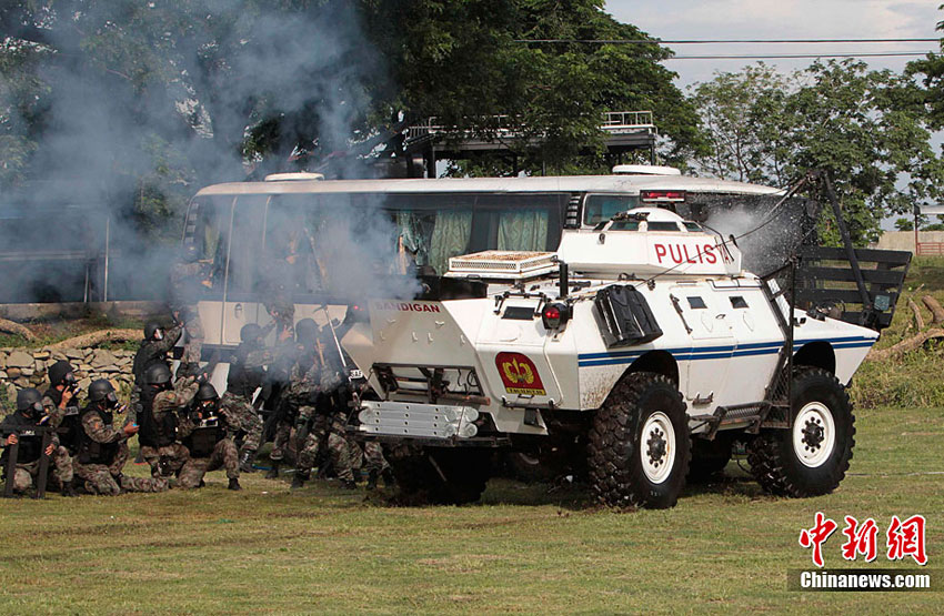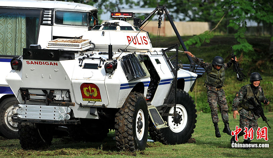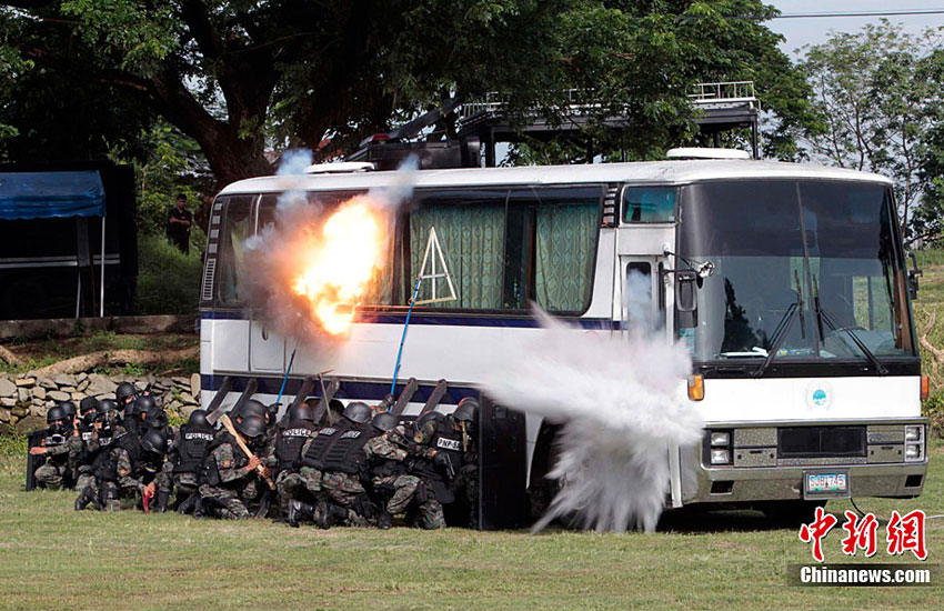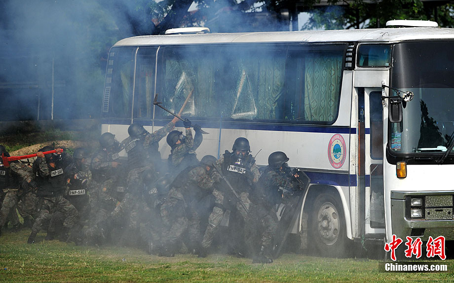 当地时间9月9日,菲律宾警察特别行动部队成员在菲律宾首都马尼拉附近的营地举行了人质救援演习。菲律宾总统阿基诺三世亲自前往观看该救援演习。