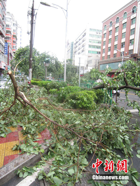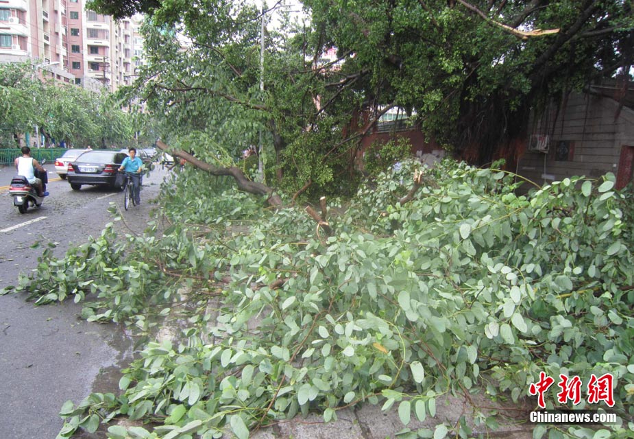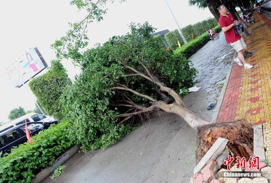 今年第10号台风“莫兰蒂”10日凌晨3时30分登陆福建石狮,近中心最大风力12级(35米/秒),给泉州带来了狂风暴雨。图为9月10日上午台风过后、泉州市区观音路上一棵被台风“莫兰蒂”连根拔起的大树,斜倒在路边。中新社发 孙虹 摄