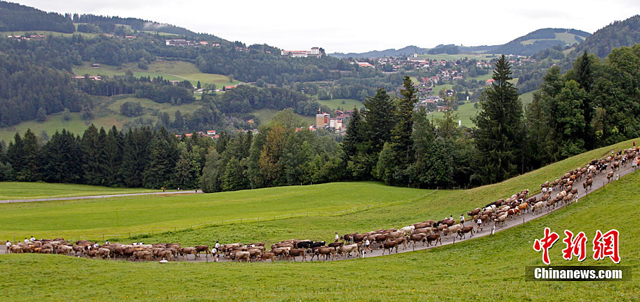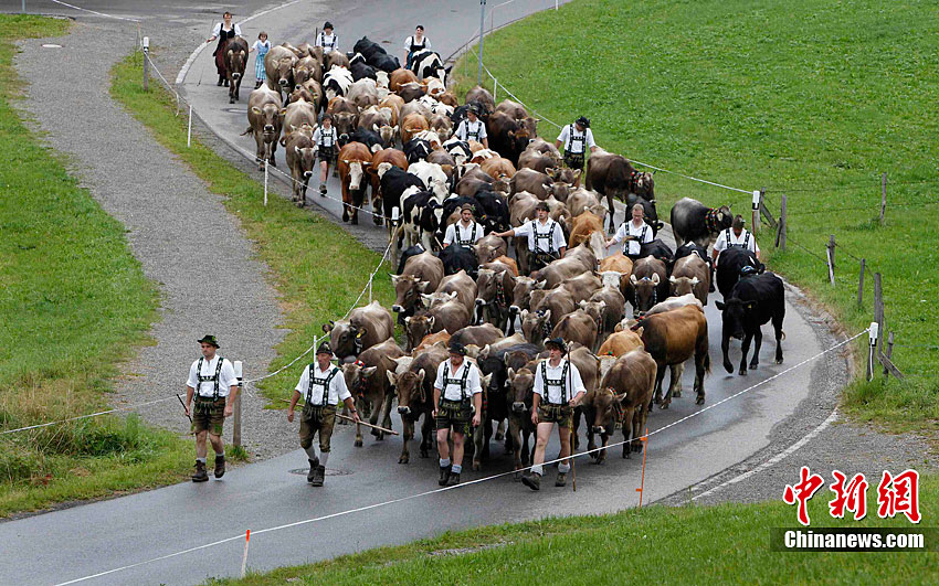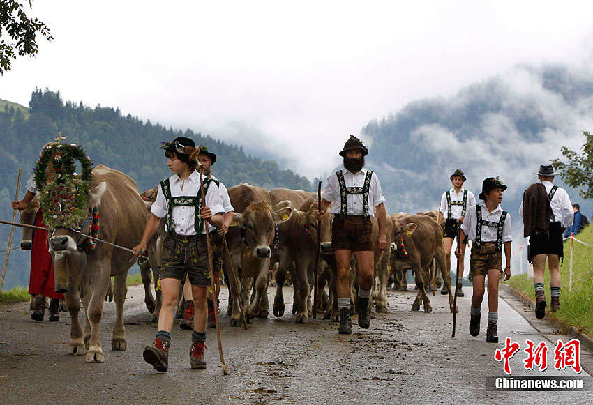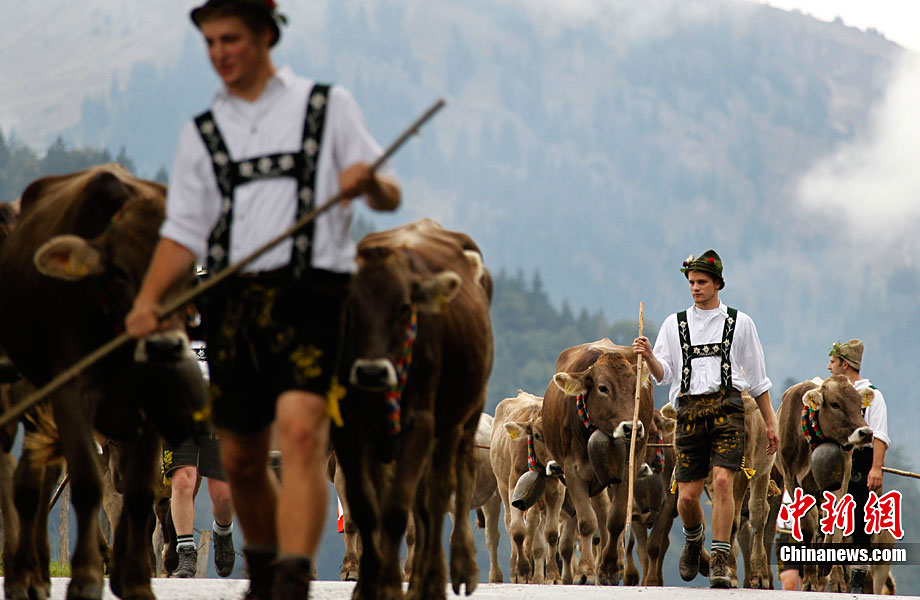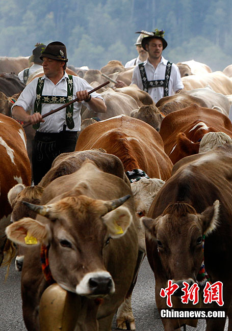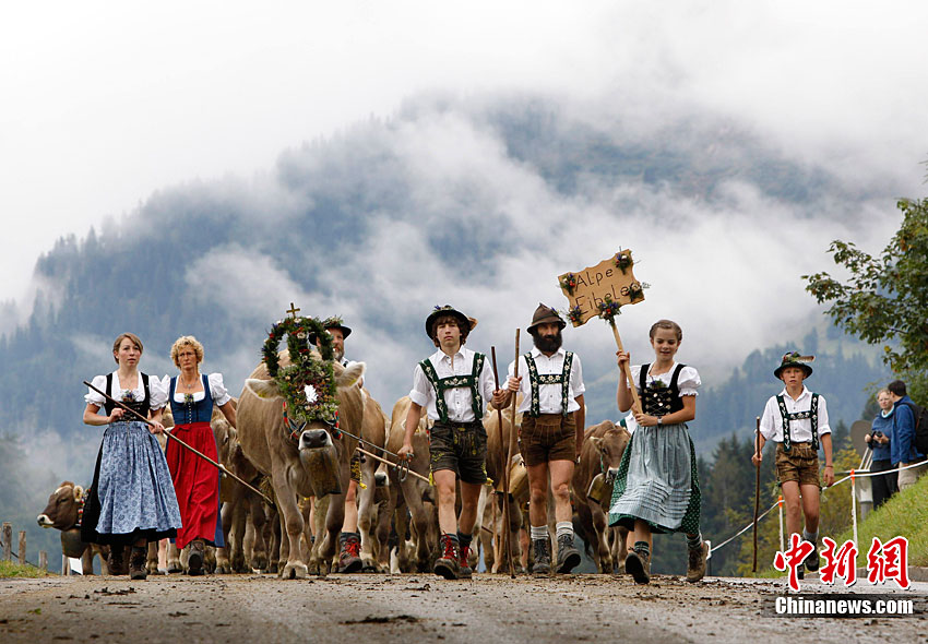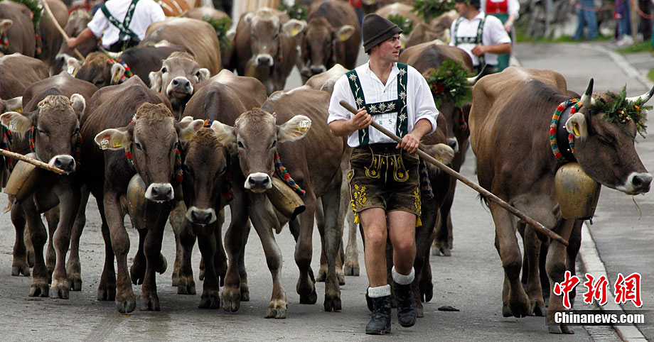 当地时间9月10日,德国奥博斯托芬举行传统的赶牛仪式。在山上待了一个夏天后,超过1200头牛回到山谷,当地人会把一个牛头进行装饰,以此纪念牛群安全归来。