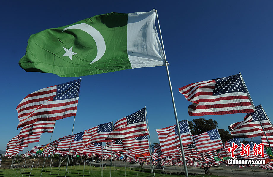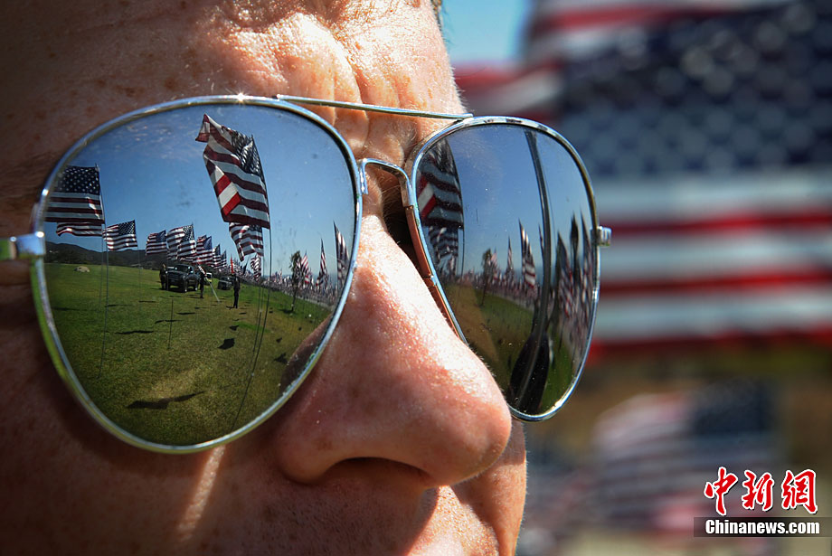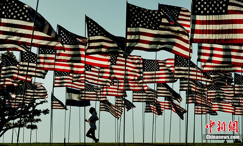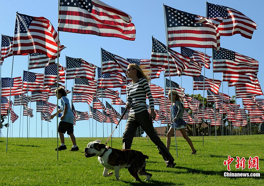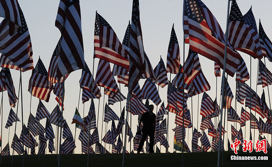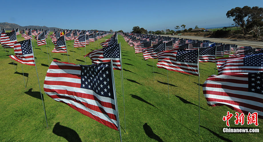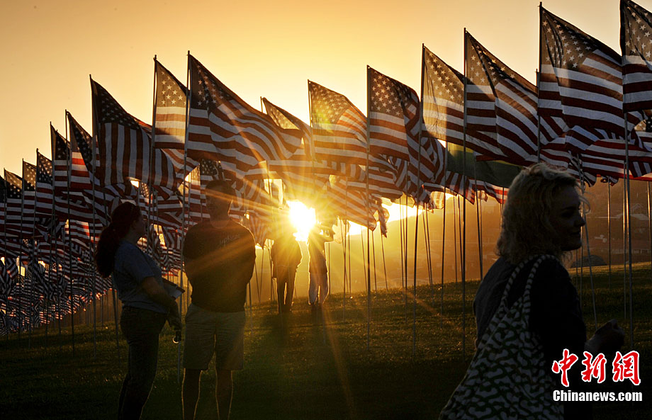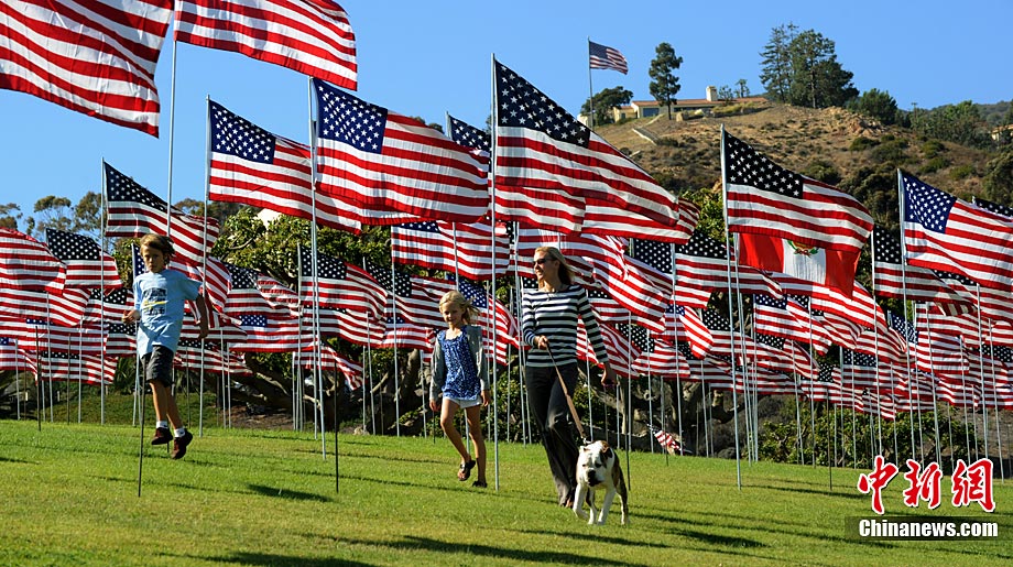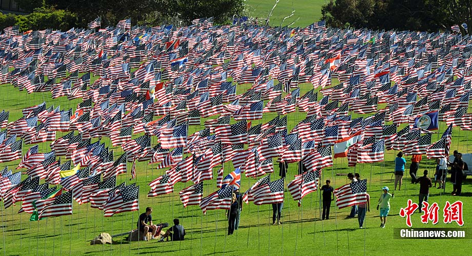 当地时间9月10日,在美国加利福尼亚州的马里布,一些大学生在马里布佩珀代恩大学的草坪上插上近3000面美国国旗和其它国家和地区的旗帜,纪念“9·11”恐怖袭击事件的遇难者。