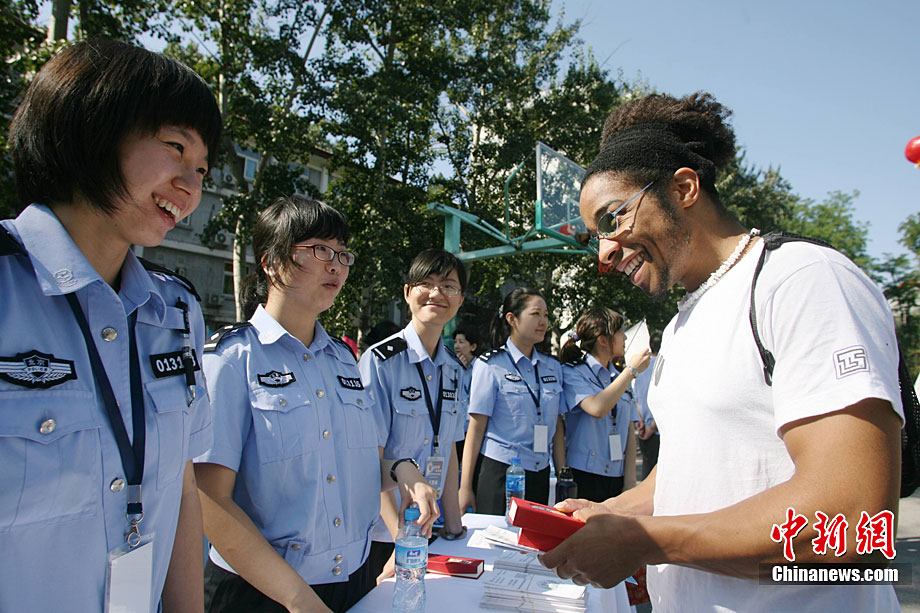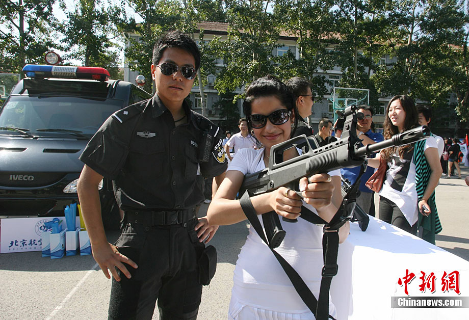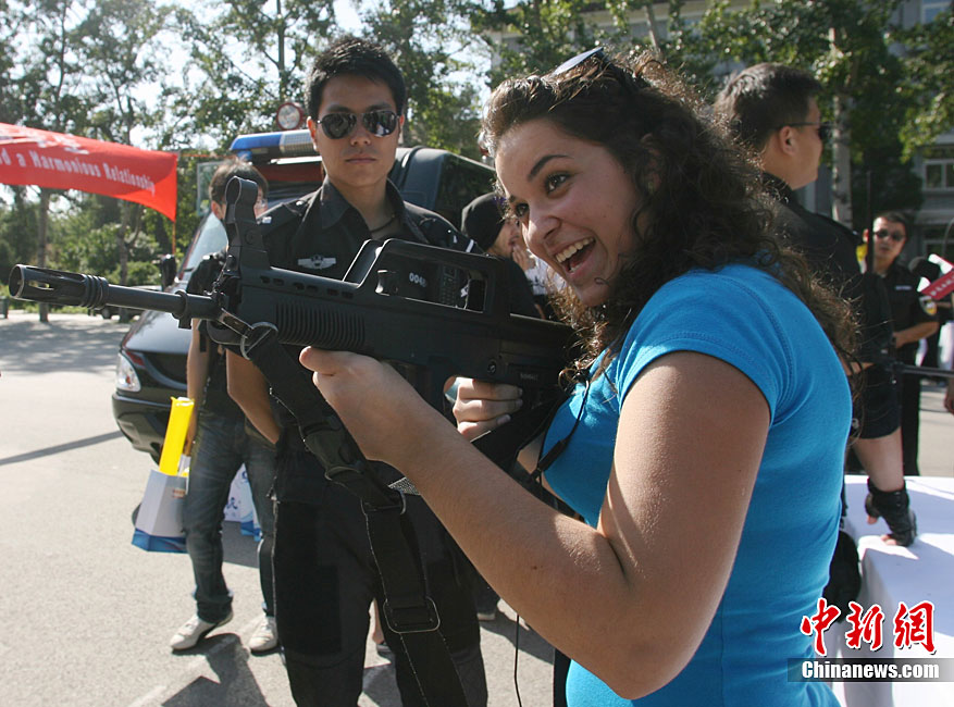 9月11日,北京语言大学一留学生在北京特警的讲解下试用新型警用枪支。当日,北京市公安局在北京语言大学举办“平安北京进校园”主题活动。民警通过面对面的交流为外国留学生提供咨询服务,用英、德、西、日、韩5种语言,解答外国留学生在京居留、学习生活方面的各种问题,致力于提高外国留学生的安全感和满意度。中新社发 苏丹 摄