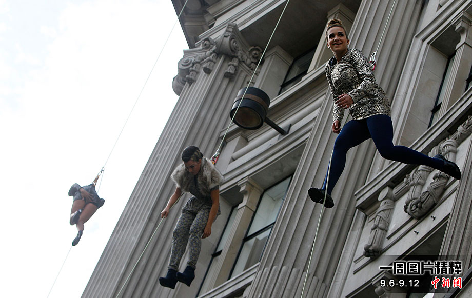 当地时间9月6日,一批模特在英国伦敦挂上钢丝,在大楼外上演了一场精险刺激的空中时装秀。这场时装秀是为了宣传即将到来的英国时装周而特别设计的。