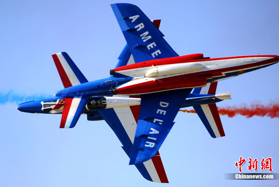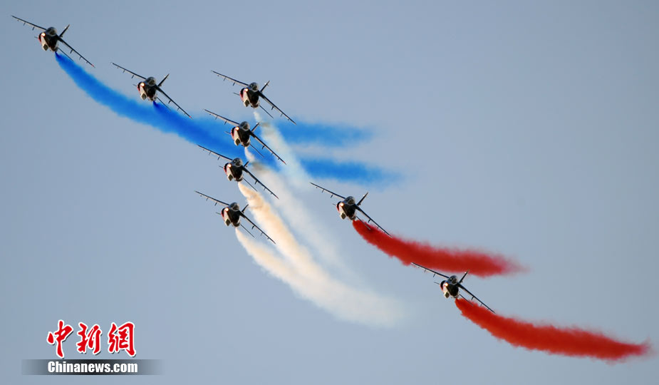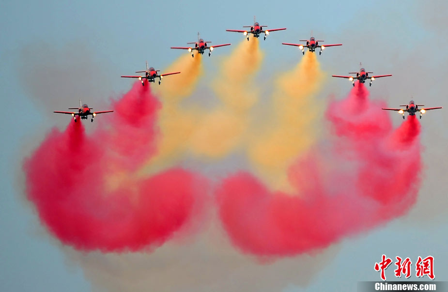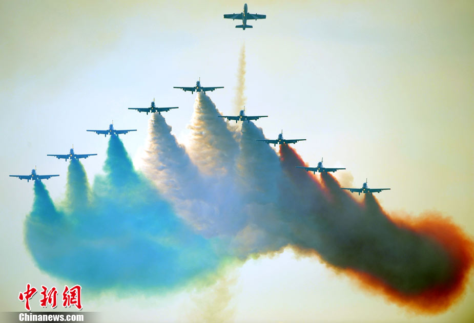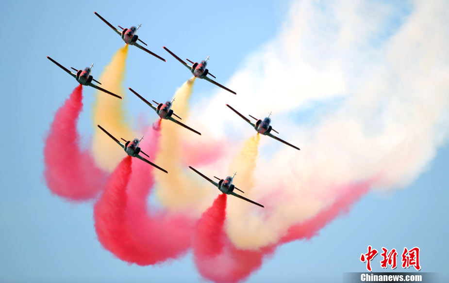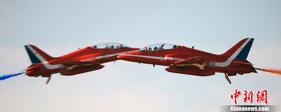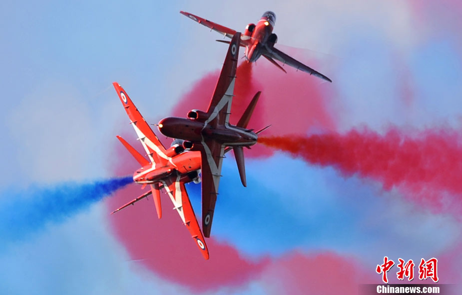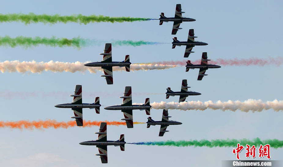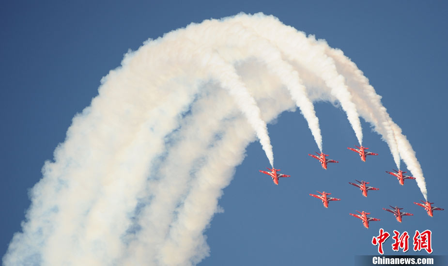9月12日,为了庆祝意大利“三色箭”特技飞行表演队成立50周年,多国飞行表演队“齐聚”意大利,在Rivolto军事基地进行了精彩的空中特技表演。图为英国”红箭“飞行表演队进行特技表演。
