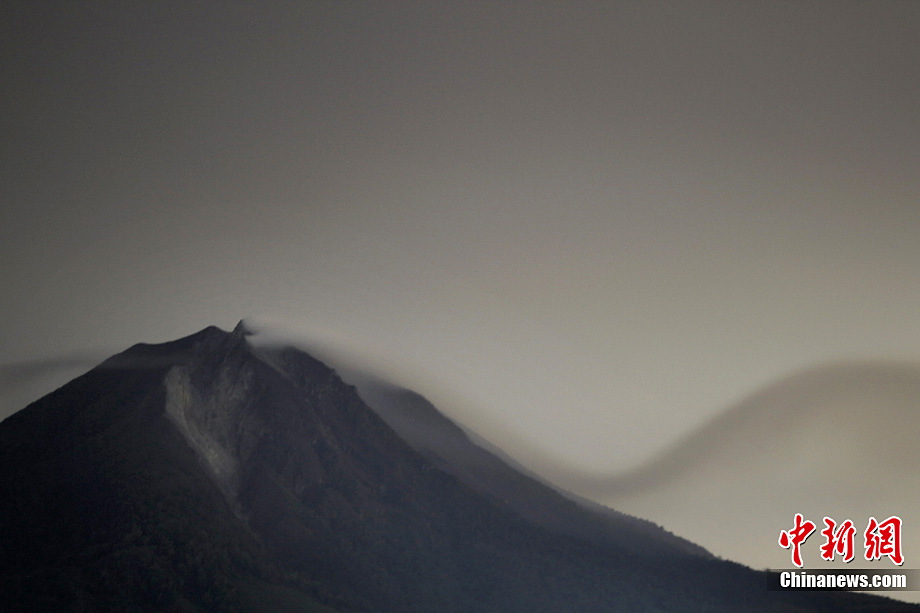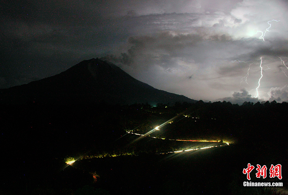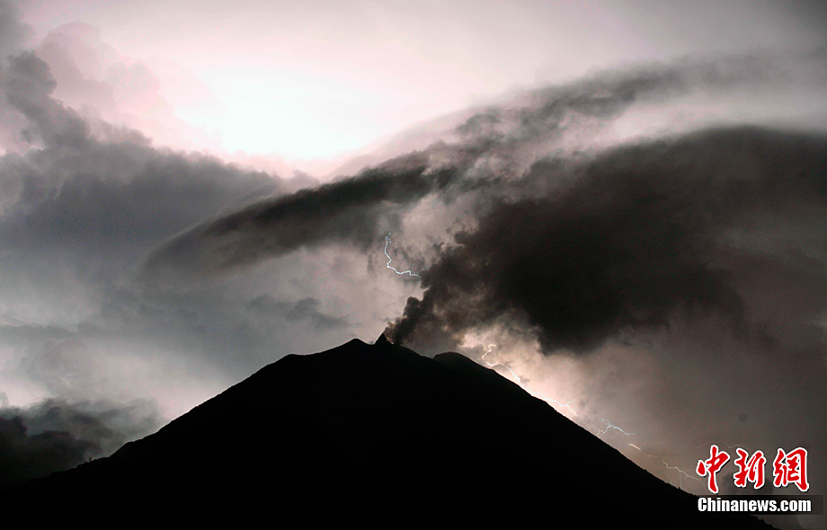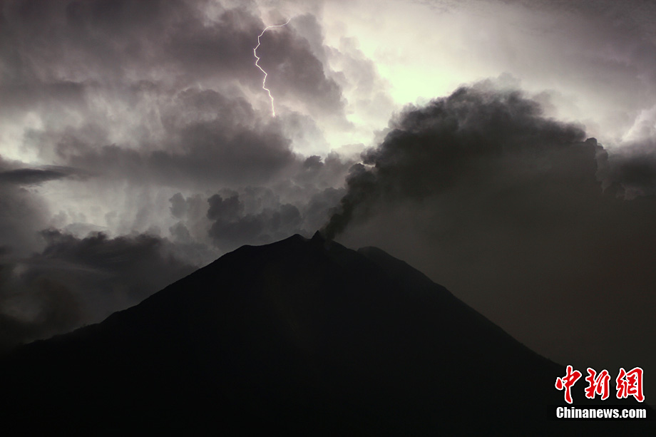 闪电与印尼锡纳朋火山黑烟空中交汇