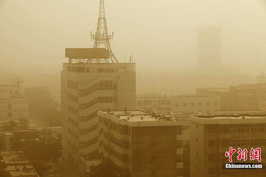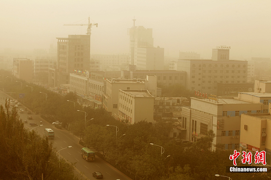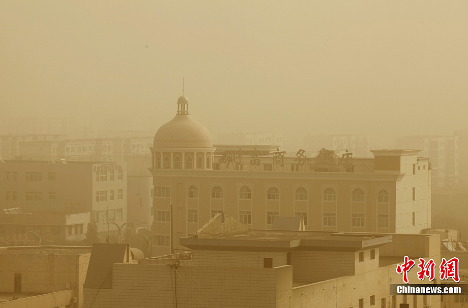 9月13日,浮尘笼罩的吐鲁番市。当日,受冷空气入侵影响,新疆吐鲁番市出现浮尘天气,给市民生活带来不便。中新社发 刘健 摄 图片来源:cnsphoto