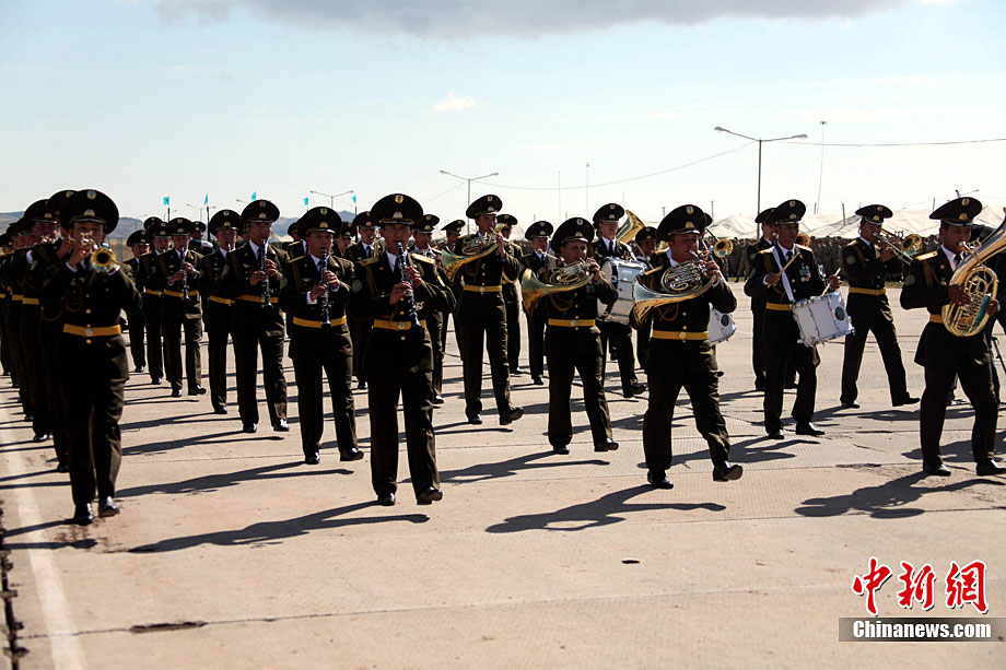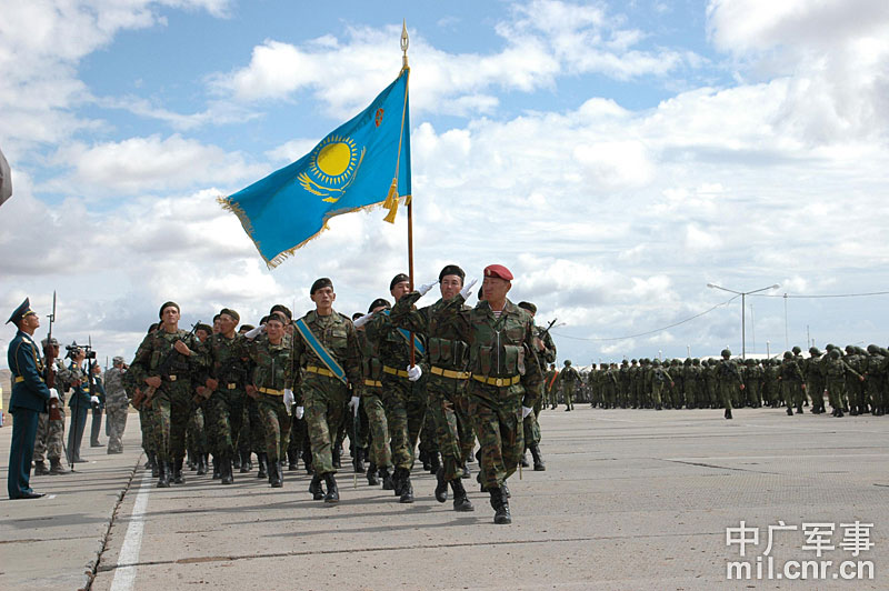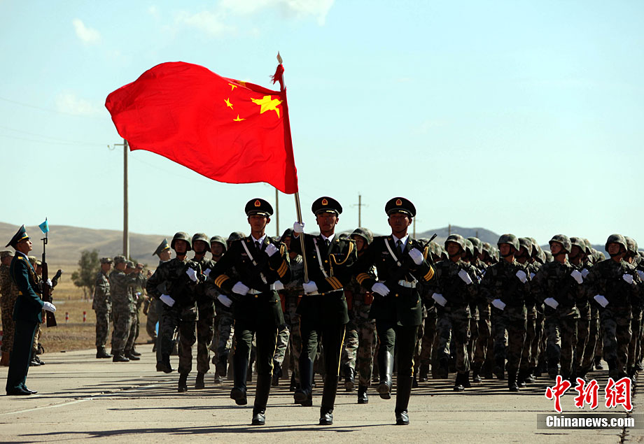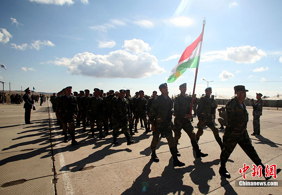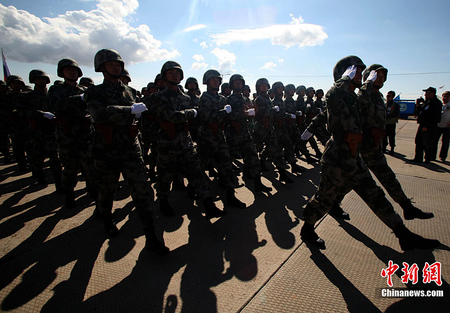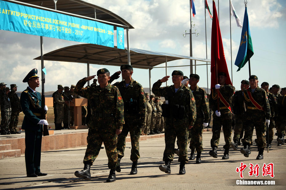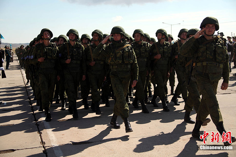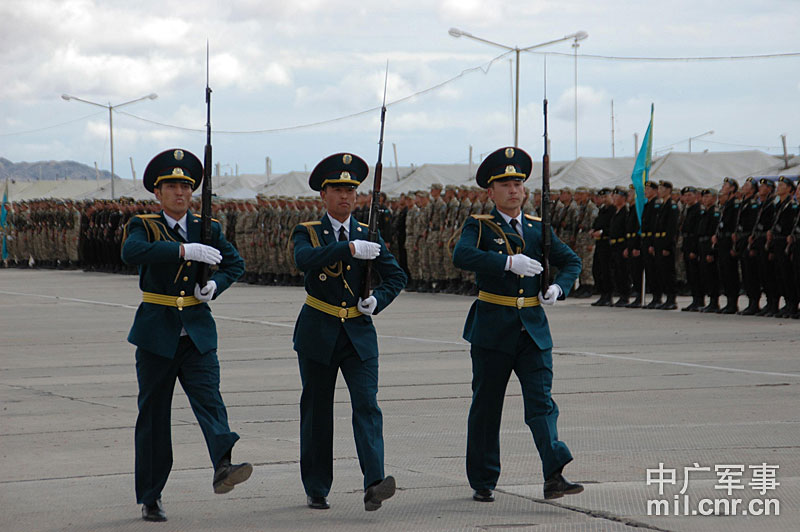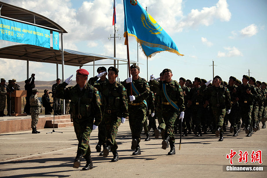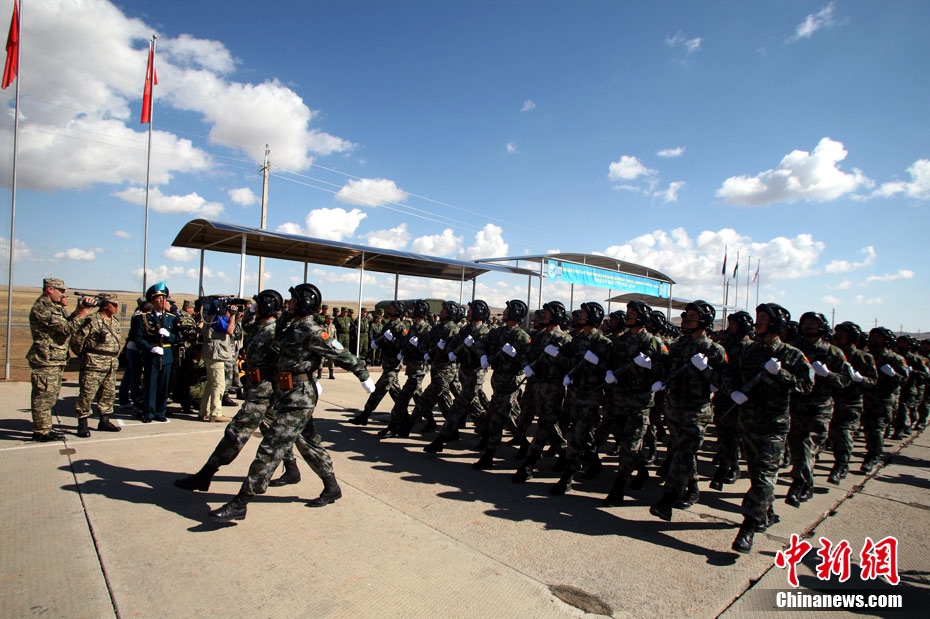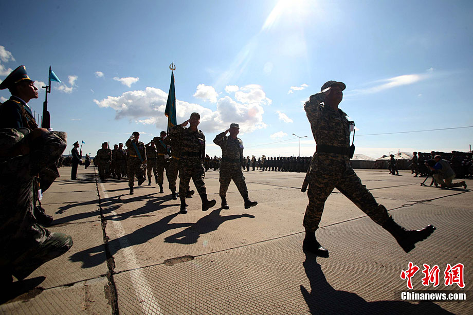 9月13日,“和平使命-2010”上海合作组织联合反恐军事演习在哈萨克斯坦马特布拉克训练场举行盛大的开训仪式,标志着这次联合军演由战役磋商阶段正式转入战役准备阶段。随后,哈、中、吉、俄、塔五方参演部队依次举行分列式,图为中方参演部队迈着矫健的步伐从开训仪式主席台前列队走过,接受检阅。中新社记者 孙自法 摄