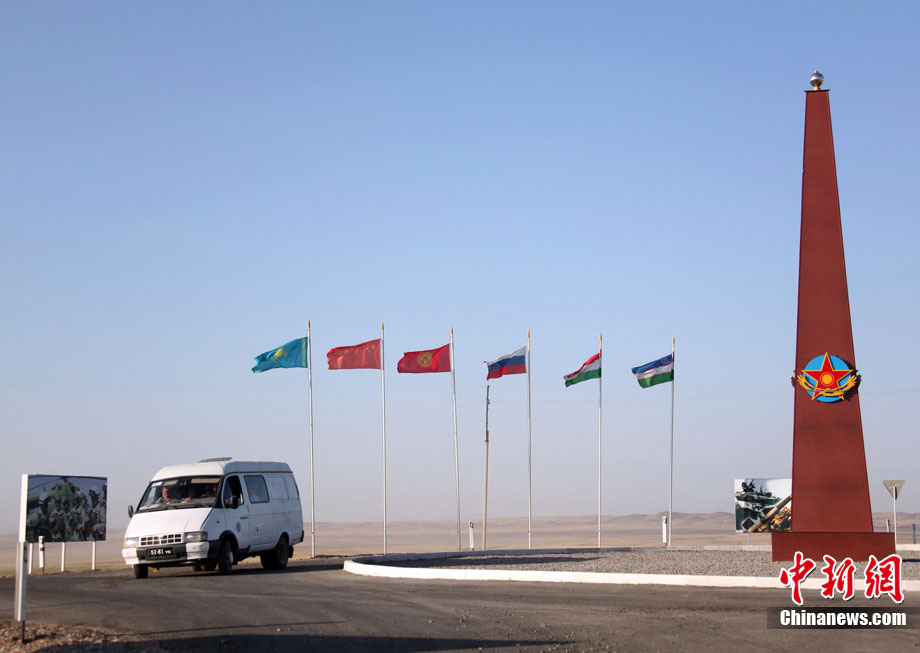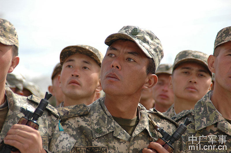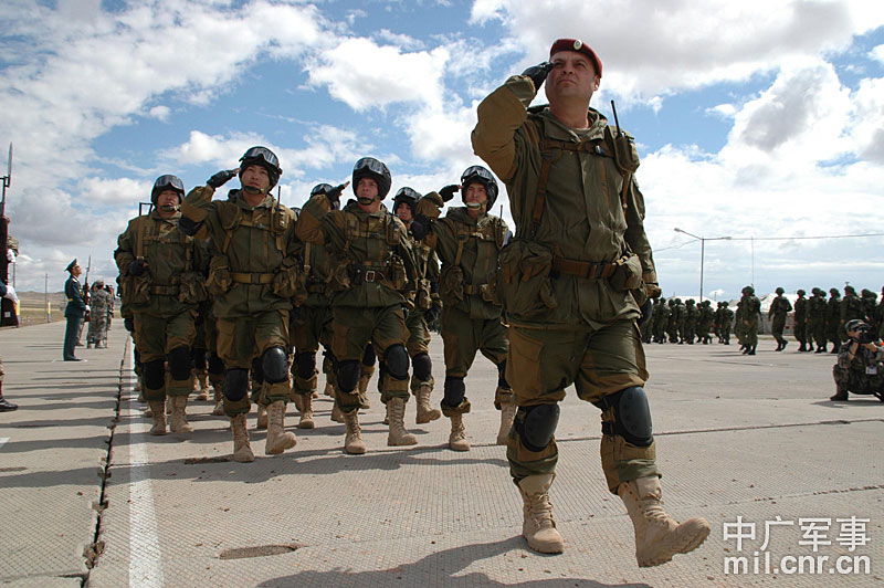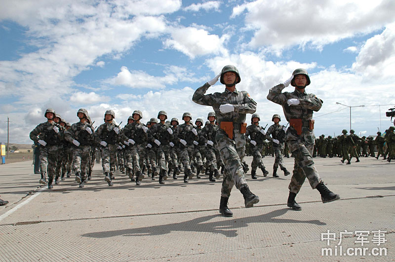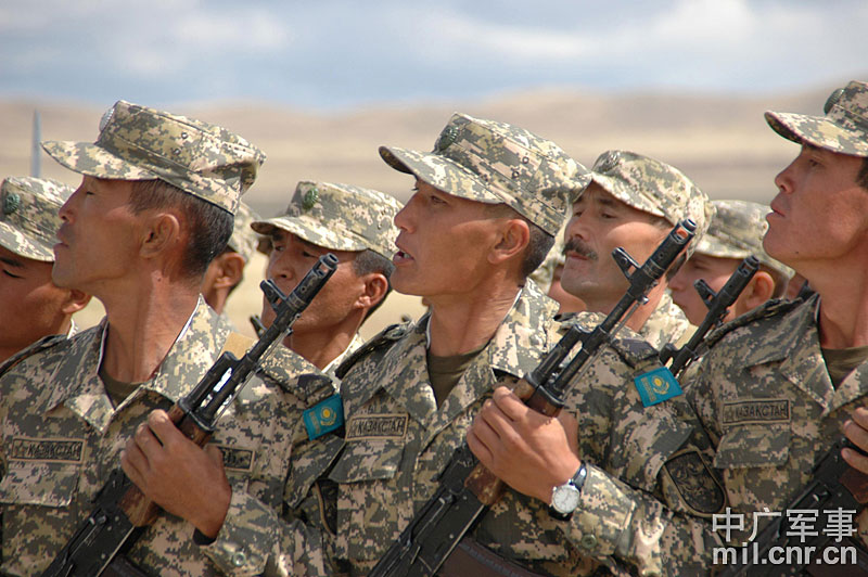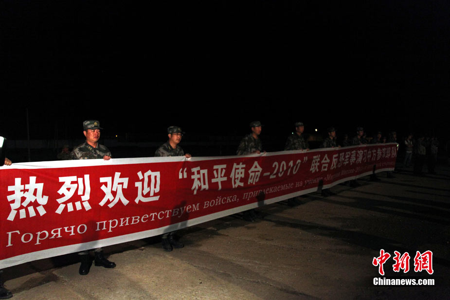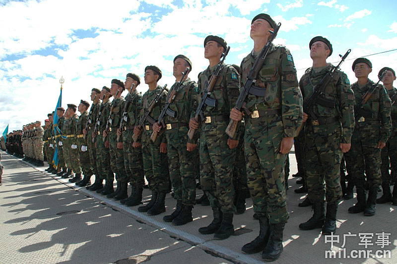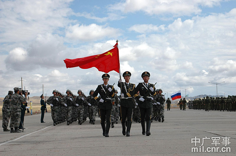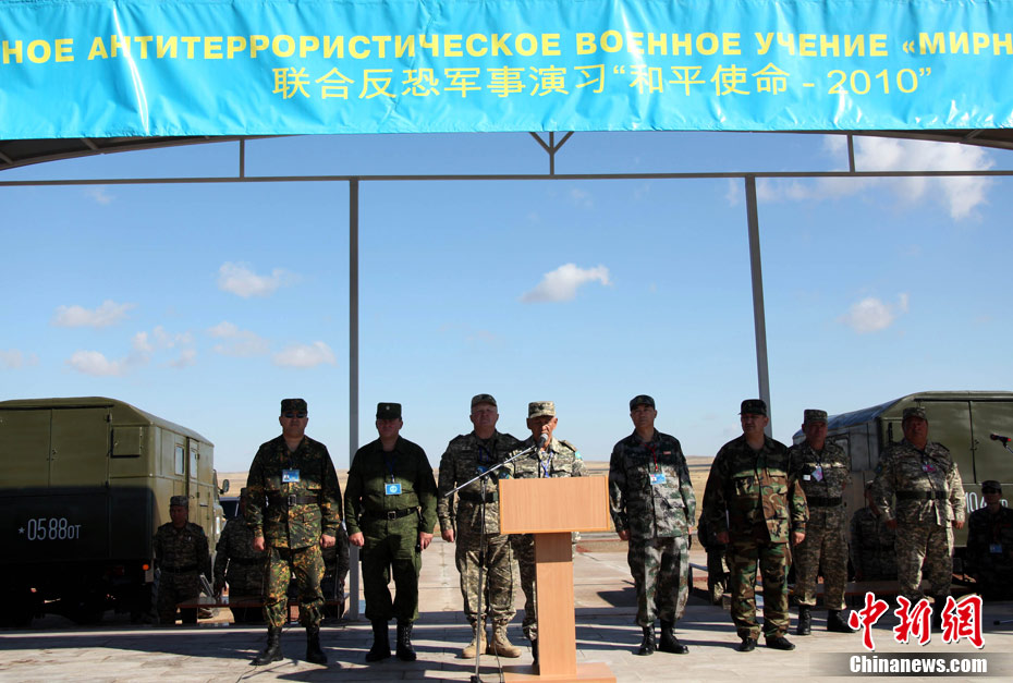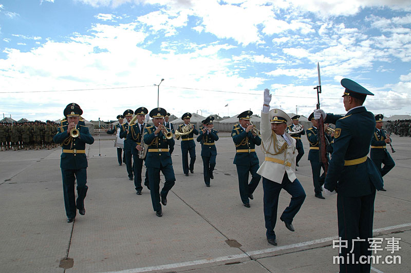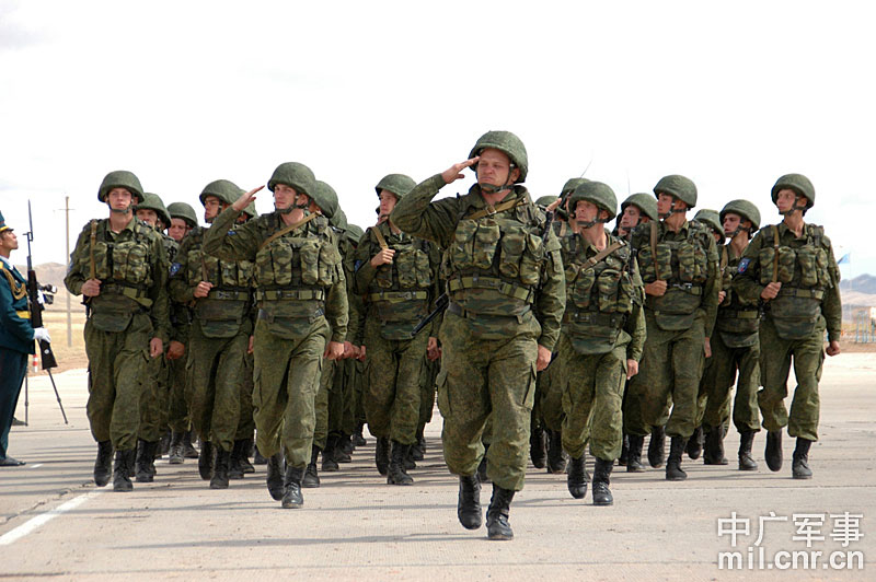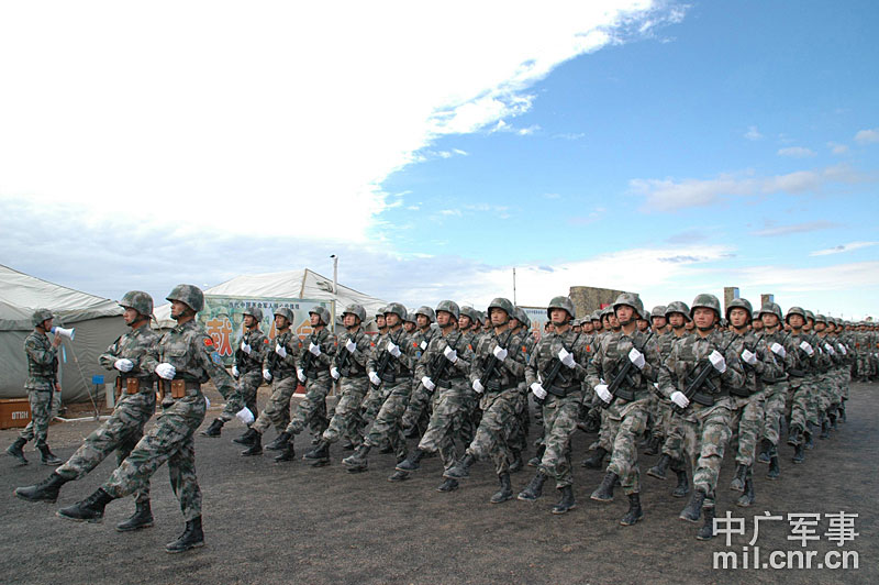 9月13日,“和平使命-2010”上海合作组织联合反恐军事演习在哈萨克斯坦马特布拉克训练场举行盛大的开训仪式,标志着这次联合军演由战役磋商阶段正式转入战役准备阶段。随后,哈、中、吉、俄、塔五方参演部队依次举行分列式,图为中方参演部队迈着矫健的步伐从开训仪式主席台前列队走过,接受检阅。中新社记者 孙自法 摄