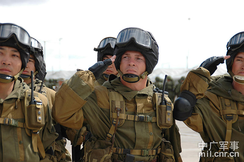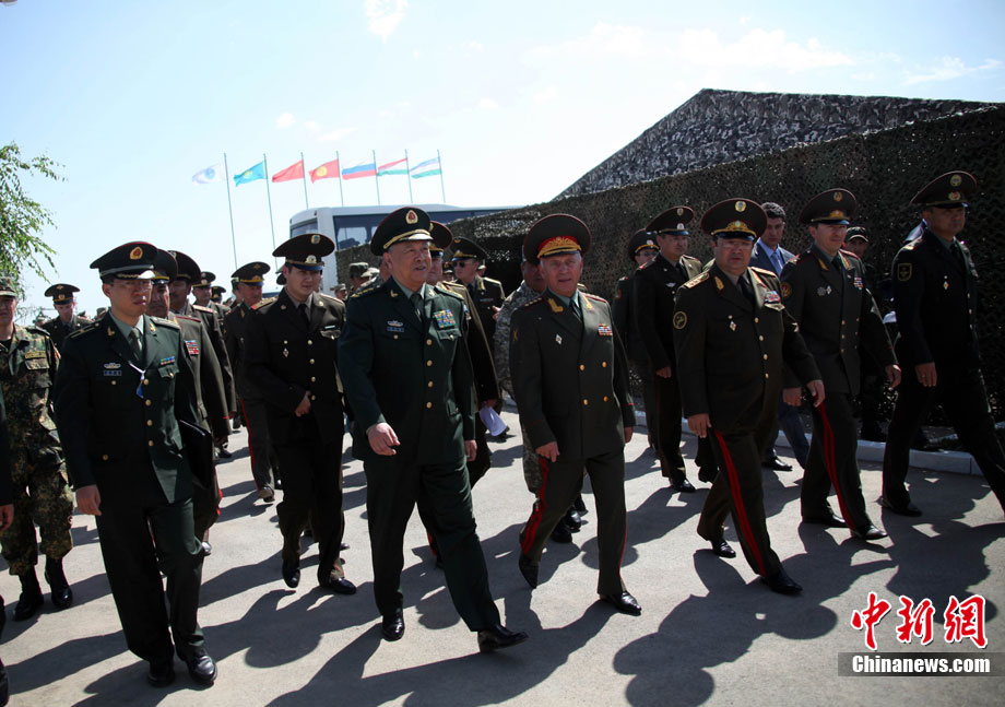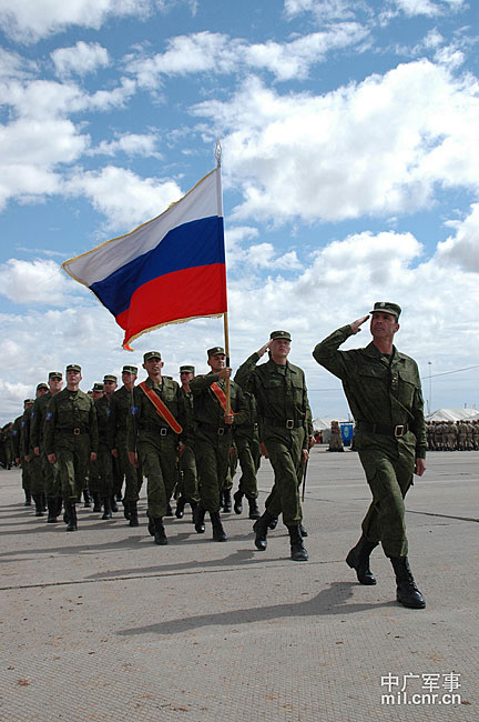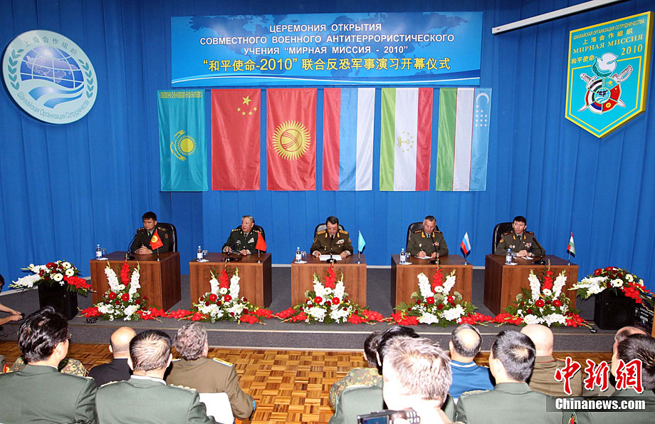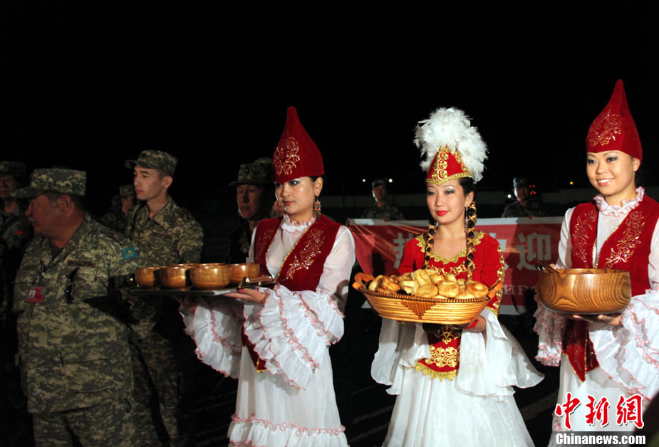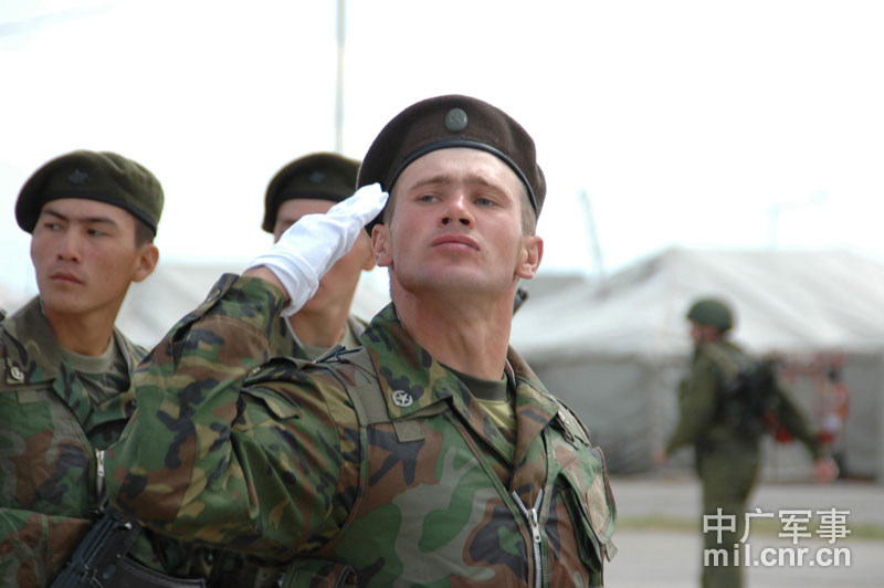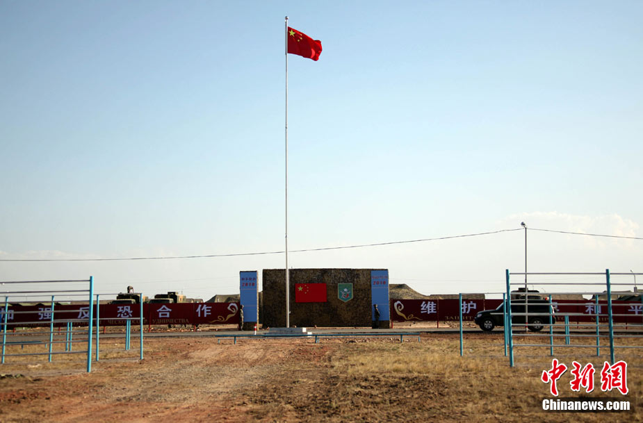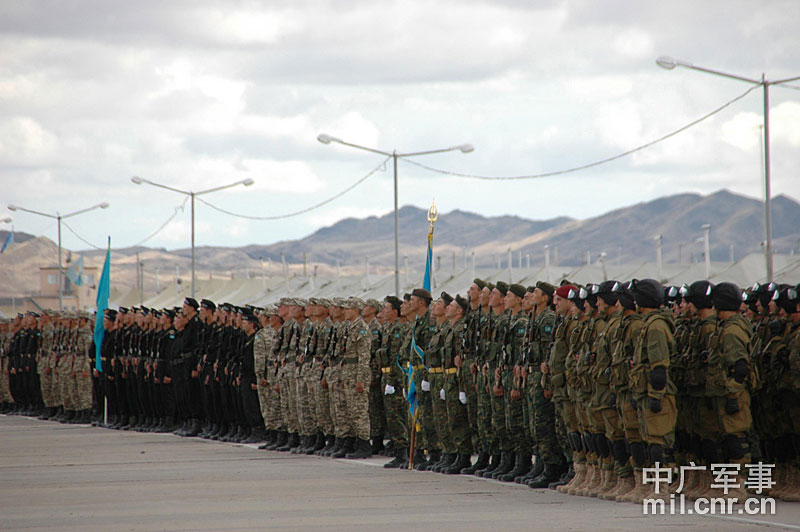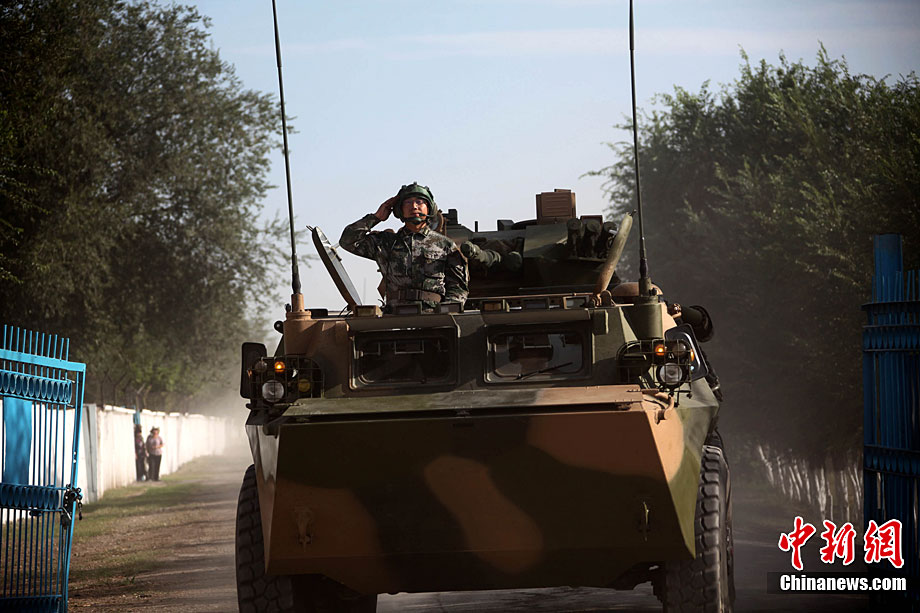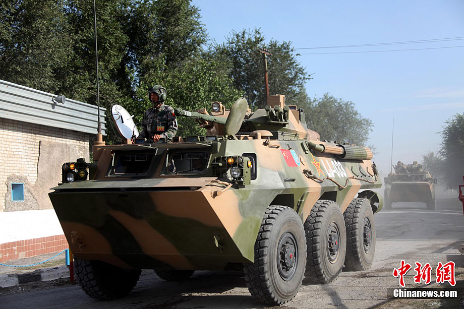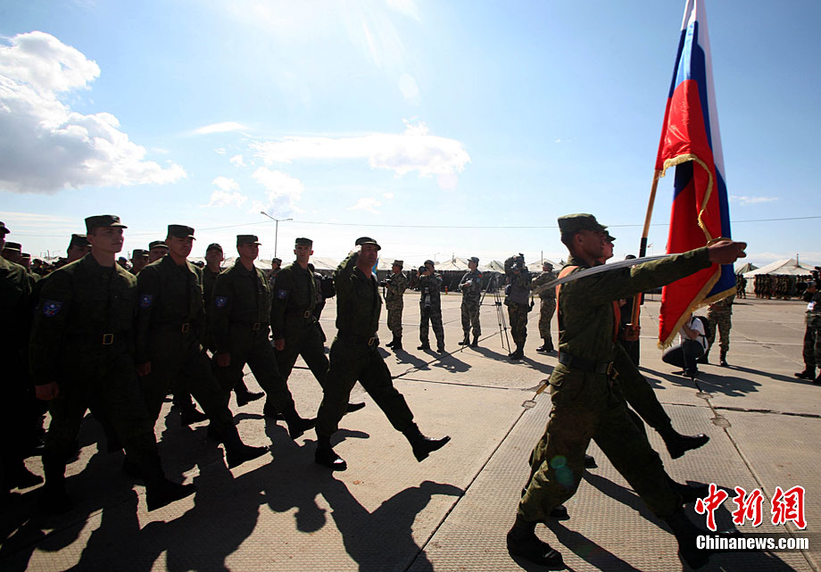9月13日,“和平使命-2010”上海合作组织联合反恐军事演习在哈萨克斯坦马特布拉克训练场举行盛大的开训仪式,标志着这次联合军演由战役磋商阶段正式转入战役准备阶段。随后,哈、中、吉、俄、塔五方参演部队依次举行分列式,图为中方参演部队迈着矫健的步伐从开训仪式主席台前列队走过,接受检阅。中新社记者 孙自法 摄