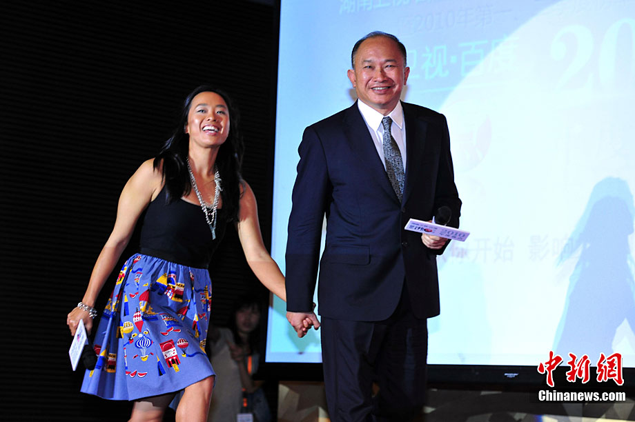 9月13日,“湖南卫视·百度娱乐沸点2010年度盘点”启动仪式暨第一、第二季度榜单公布仪式于北京举行。刚刚获得威尼期电影节“终身成就奖”的吴宇森导演携女儿吴飞霞首次一起公开亮相内地。吴飞霞在吴宇森执导,云集杨紫琼、大S等众多国际明星的最新武侠大片《剑雨》中出演了重要角色,她也成为现场媒体关注的焦点人物,然而从小在美国长大的吴飞霞国语水平看来有限,无奈只好讲英文请老爸救急当翻译,两人现场大秀父女情深。中新社记者 李学仕 摄