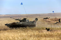 当地时间9月14日晚,“和平使命-2010”联合军演中方参演部队文艺演出队在哈萨克斯坦马特布拉克野战兵营首次登台亮相,为五国参演官兵奉献了一场精彩的文艺演出。图为男女集体舞“千手观音”节目表演。中新社记者 孙自法 摄
